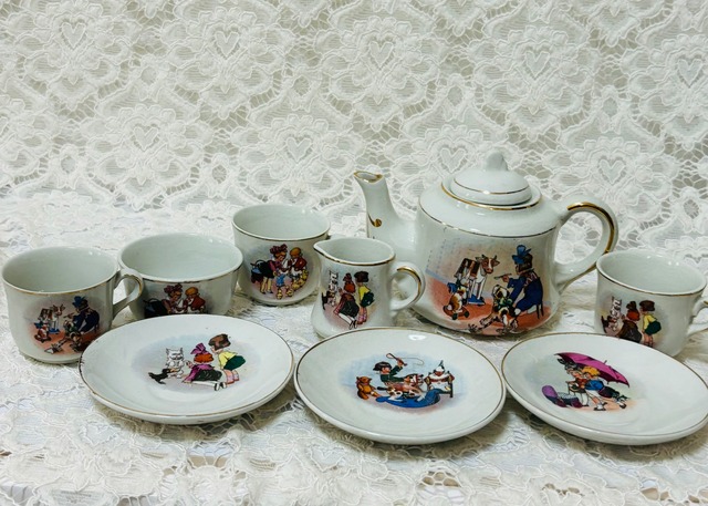 ドイツ製のティーセットです。欧州独特の可愛い絵柄で、絵柄が同じものがあまりなくて楽しめます。 大きさは手前のお皿が直径8㎝ですので、周りの個々のセットもお皿を基準にご覧になってください。 経年により、図柄が薄くなっていたり。金色の縁取りの線が薄くなっている部分があります。 割れや欠けはありません。 とても可愛いセットです。 お勧めです♪