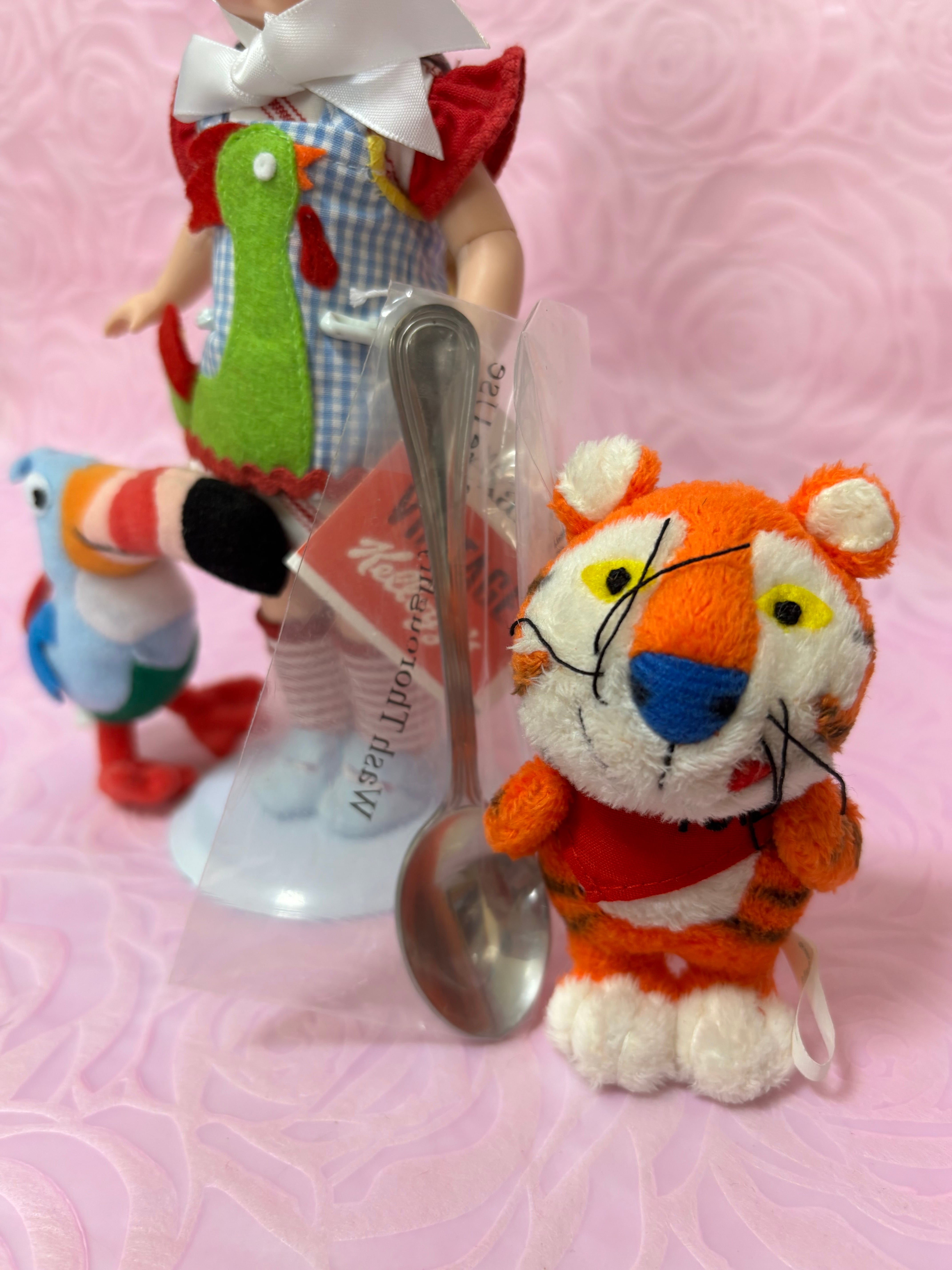 1900年代初めに会社として立ち上がったケロッグ社です。現在でもアメリカで親しまれているシリアルです。とくにタイガーのトニー、カラフルな鳥サム、緑色の鳥コーニーなどキャラクターとして親しまれてきました。この会社のキャラクターはグッズとしても多数発売されており、根強いコレクターの方がいます。2007年に誕生したこのドールですが、はつらつとしたイメージでつくられていると思います。紙タグの内側にはびっしりとケロッグ社の歴史が書かれています。