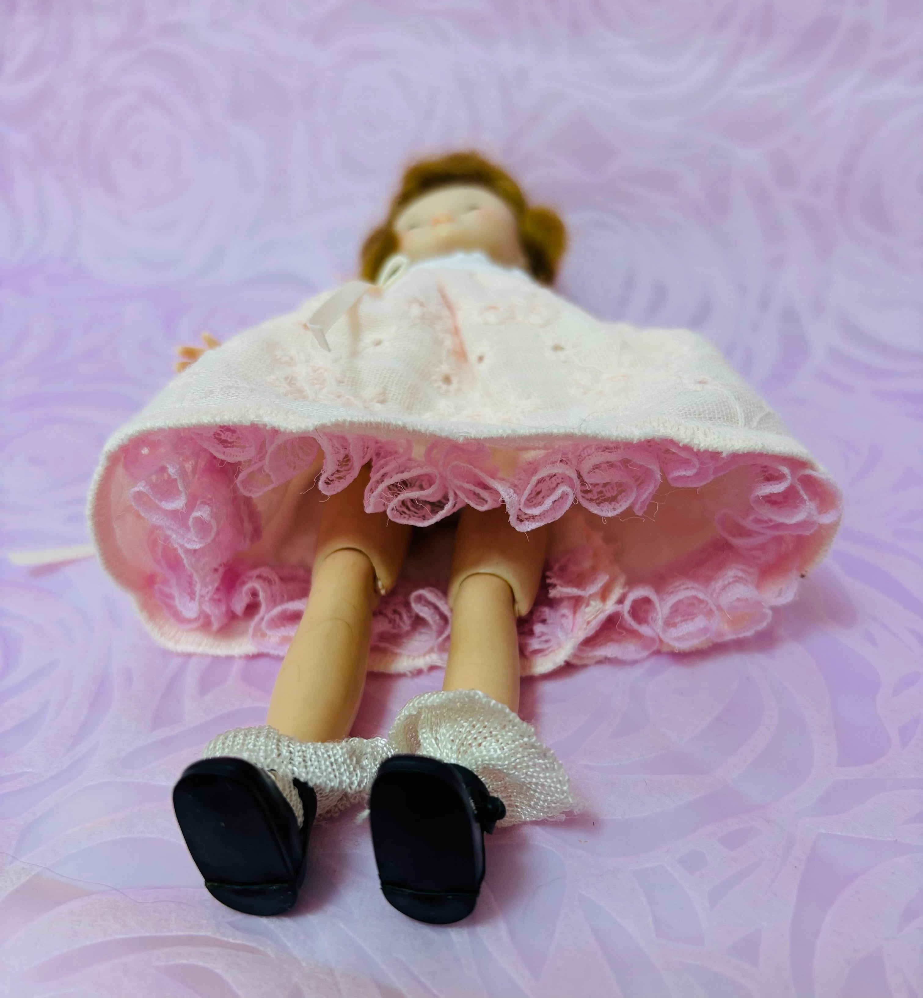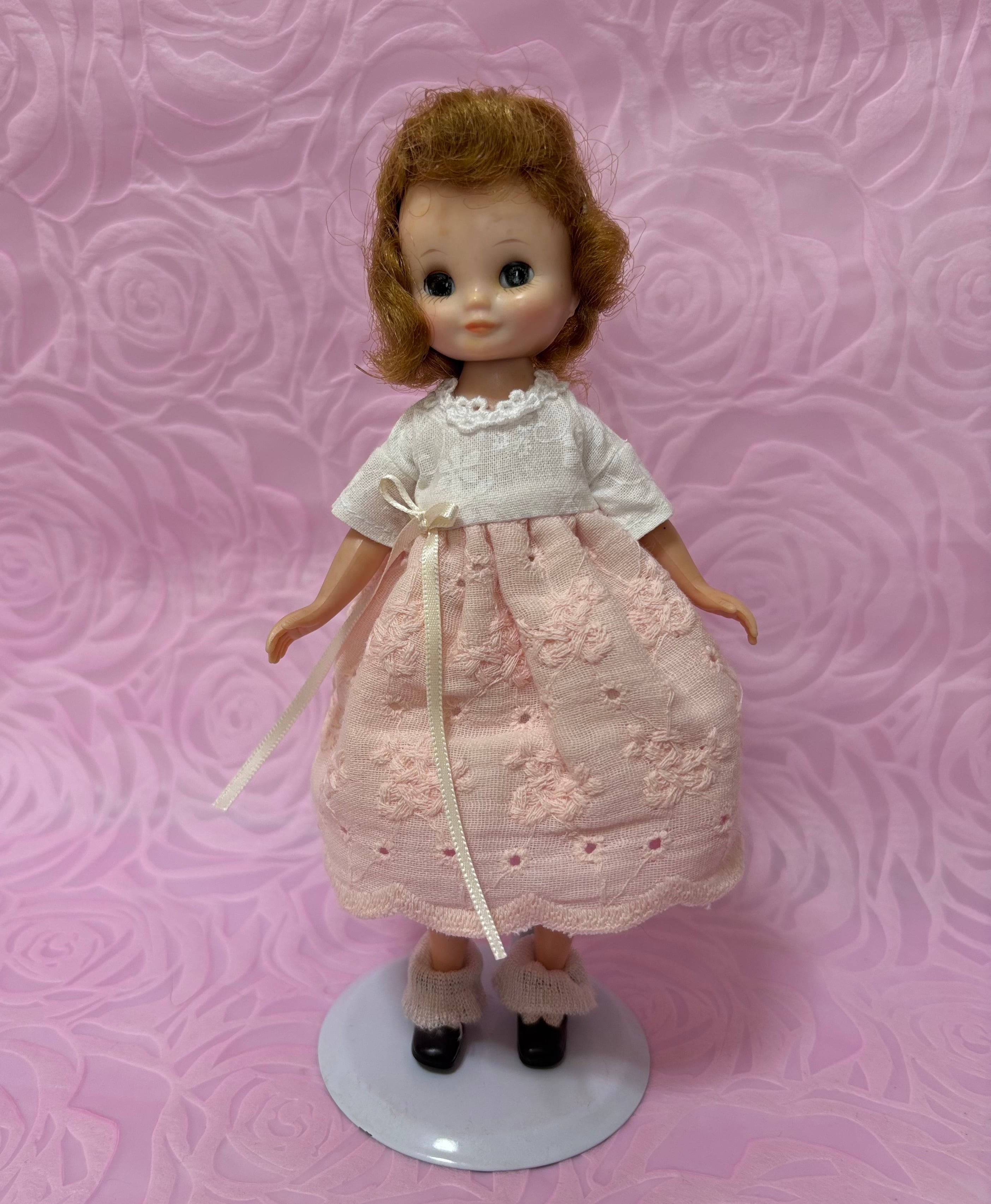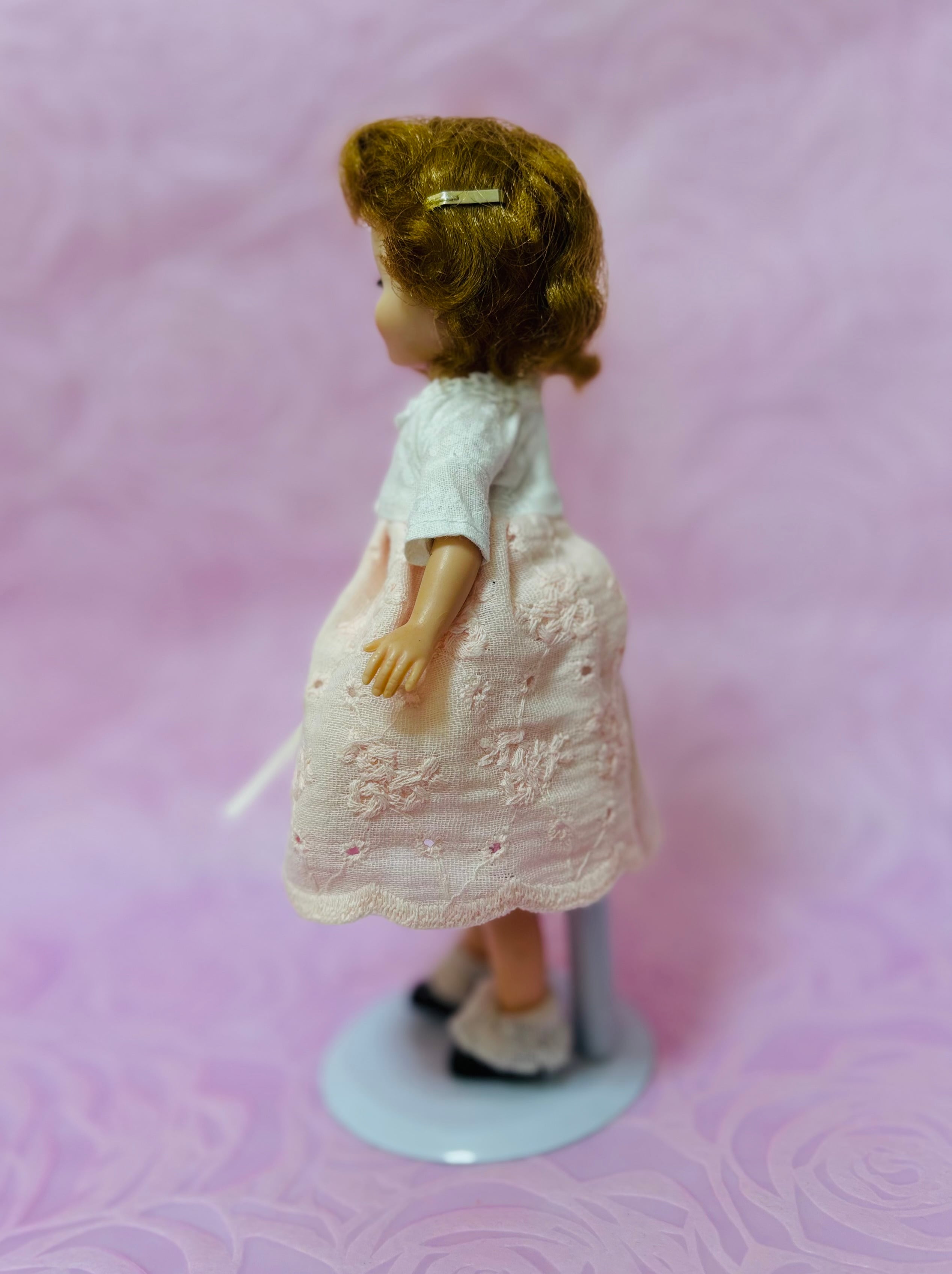 ビンテージベッツイマッコールです。1957年から1963年まで、この8インチのお人形がつくられていました。このAmerican Character社のドールは薄いプラスチックでつくられているために、遊んでいるうちに股関節が離れたり、膝のあたり亀裂が生じたりしていました。この時代まで故障が見られないのは稀少な存在になっています。今回ご紹介するベッツイマッコールは故障を持っていません。お顔の色が経年で薄くなっています。下着と靴と靴下はオリジナルです。儚げな雰囲気のベッツイマッコールです。