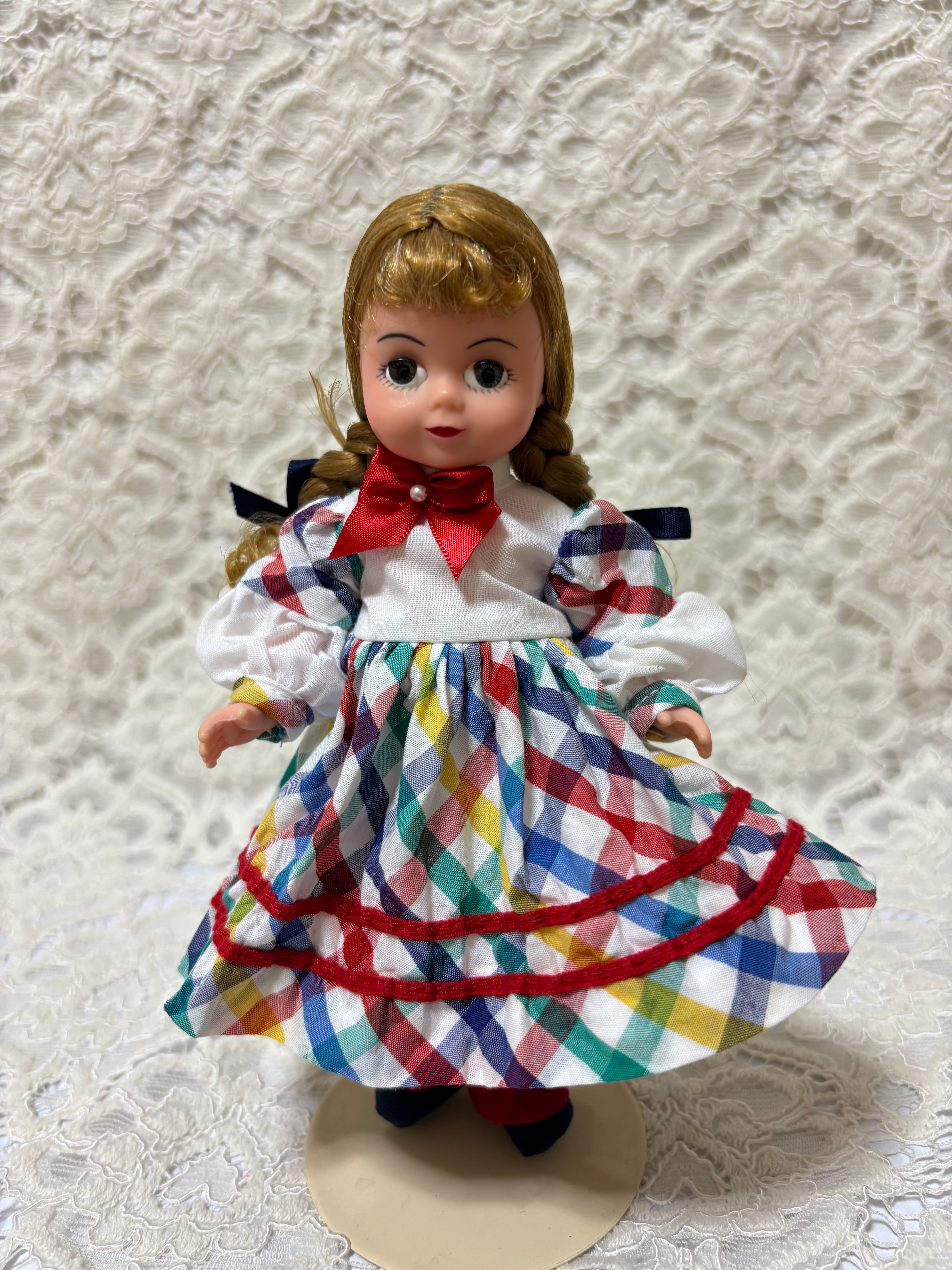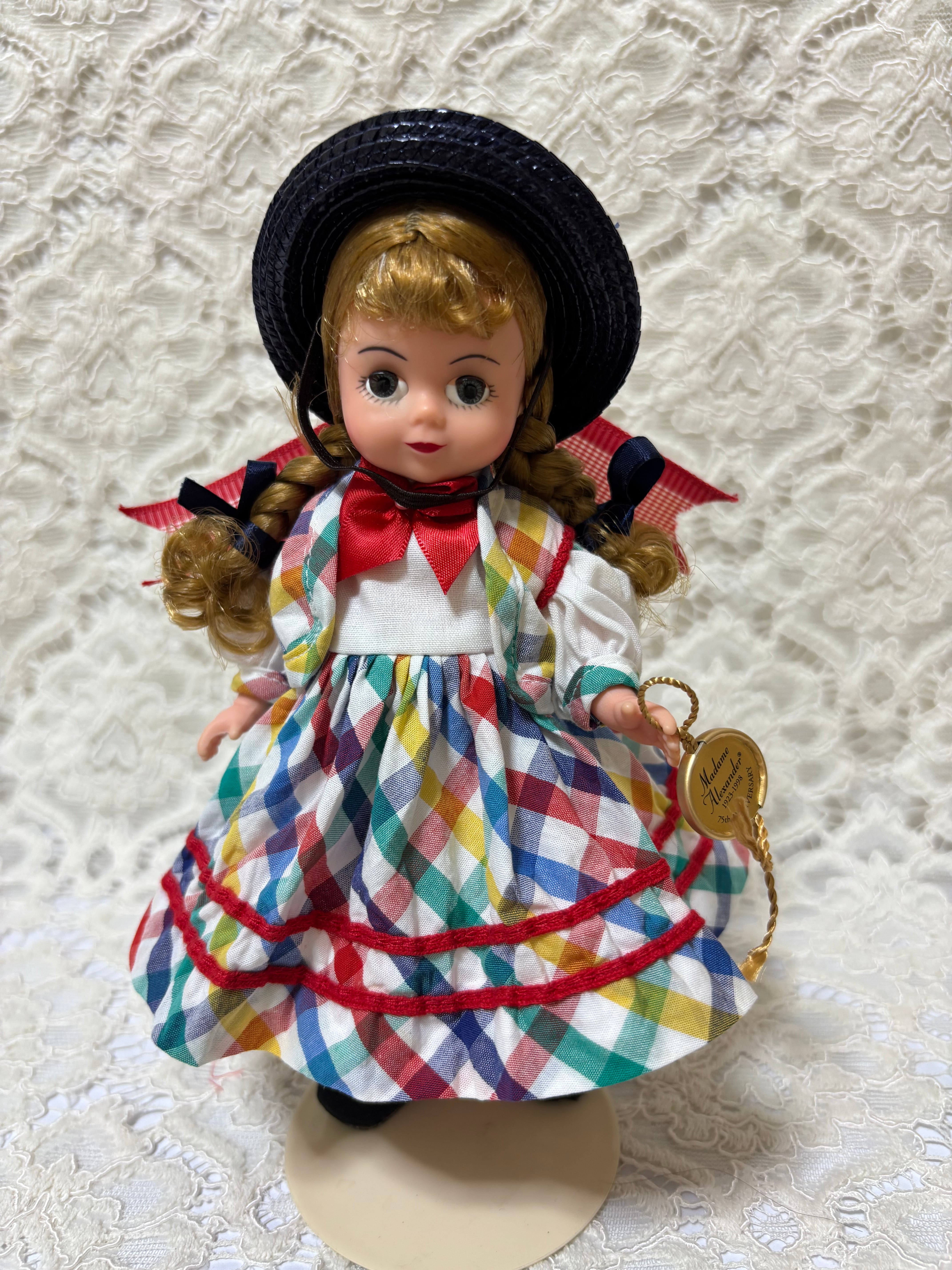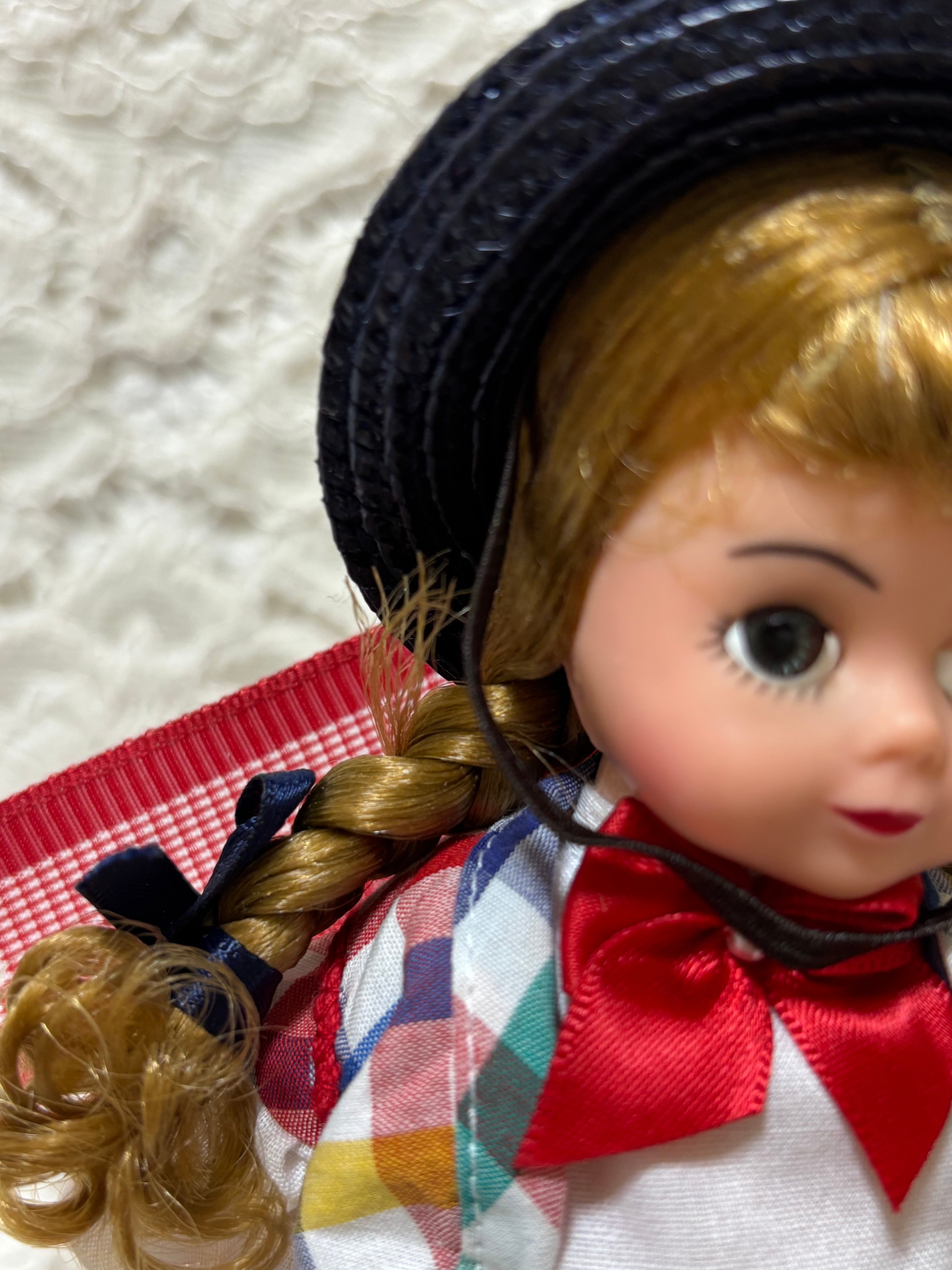 1998年に発売された、マダムアレクサンダー75周年記念ドールのGigiです。3つ難点がありまして足の裏に落書きがある。目がオープンしたまま動きません。向かって左側の三つ編みの髪の毛が一部途中から切れています。日本に来るまで遊んでもらったドールさんかと思います。