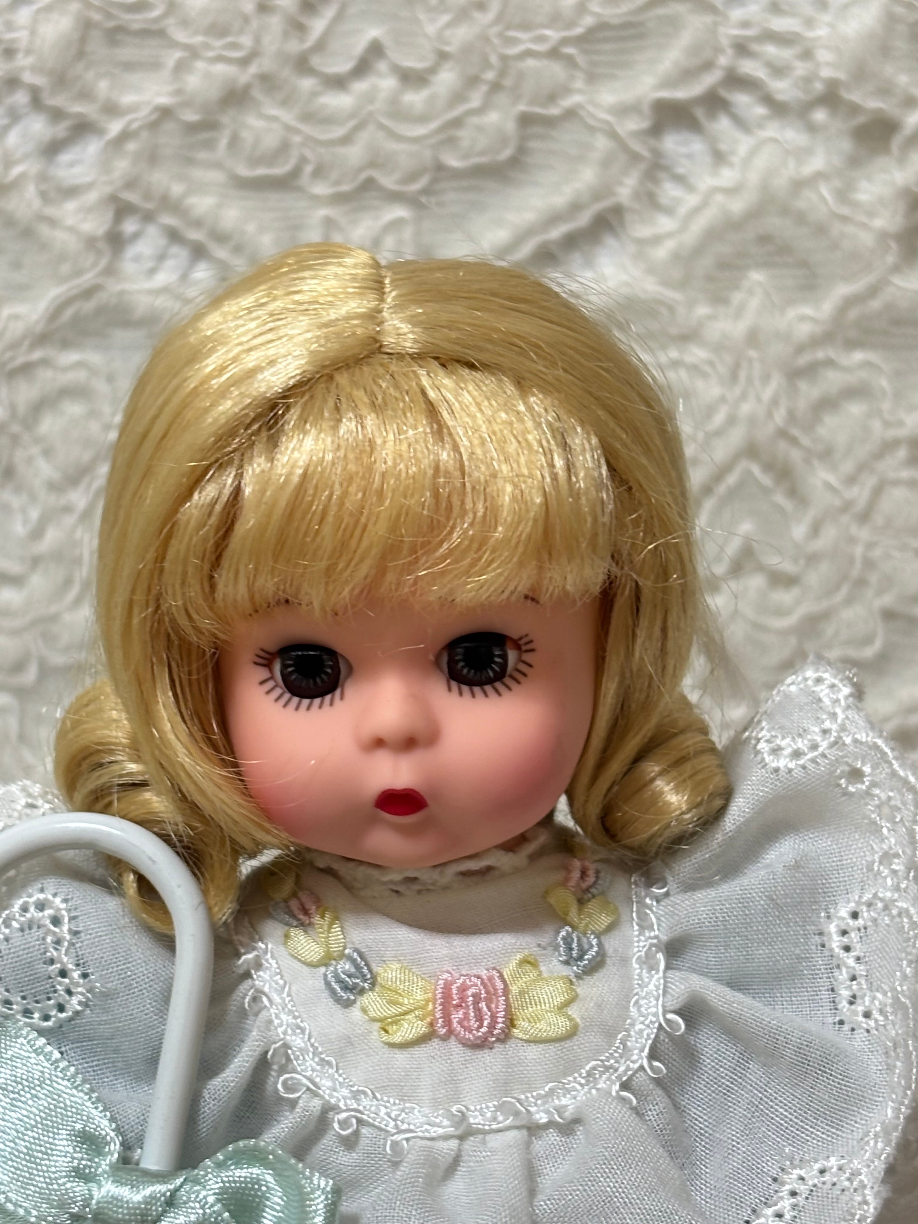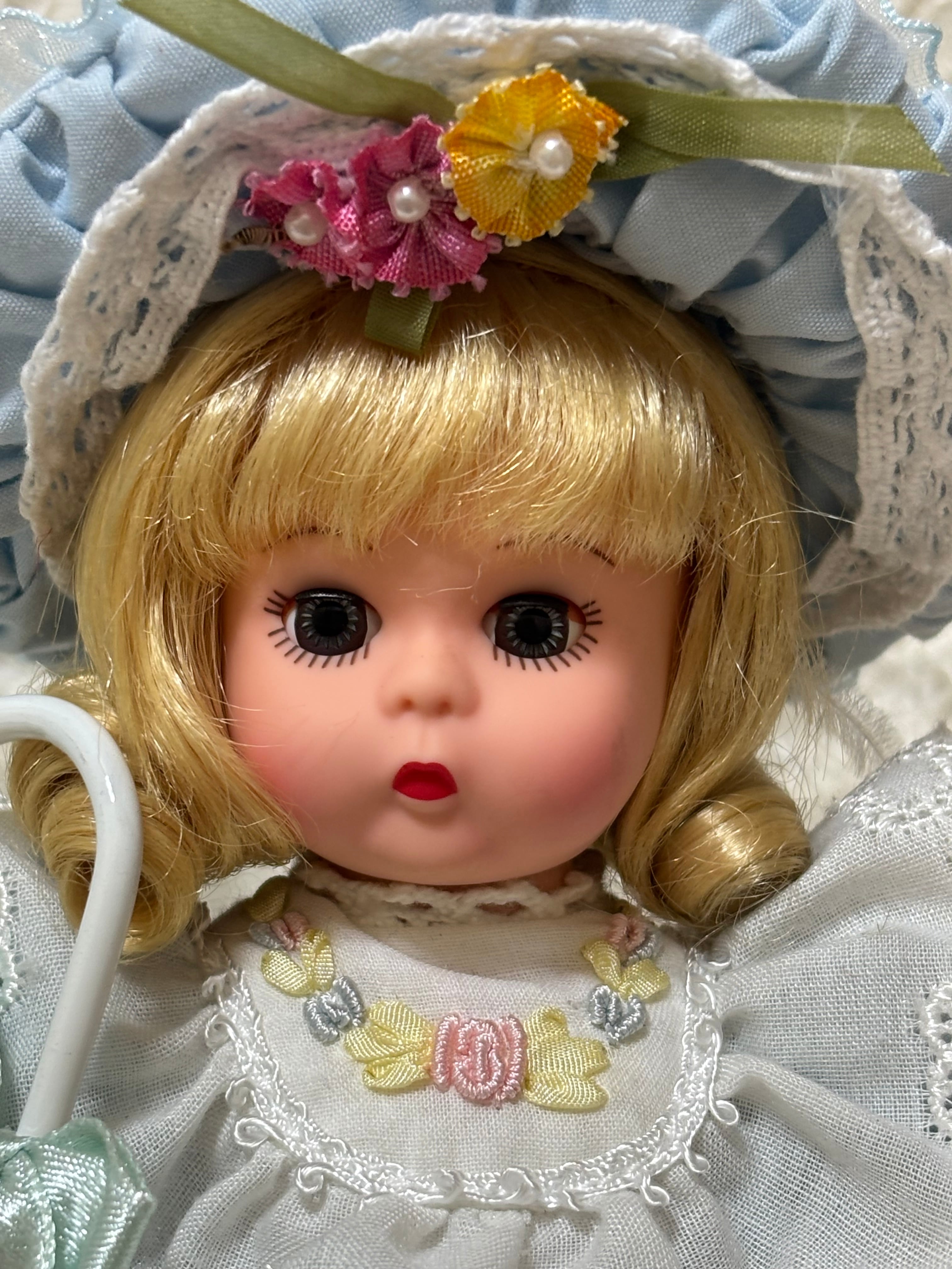 アメリカの老舗ドール会社のマダムアレクサンダードールです。2000年につくられた作品です。撮影のために杖と帽子を袋から出しました。デッドストック品でした。アメリカとイギリスで伝承されているマザーグースの中に出てくるリトルポーピープちゃんです。人気で沢山あるマザーグースの本の中によく登場します。衣装からとてもお嬢様な雰囲気です。
