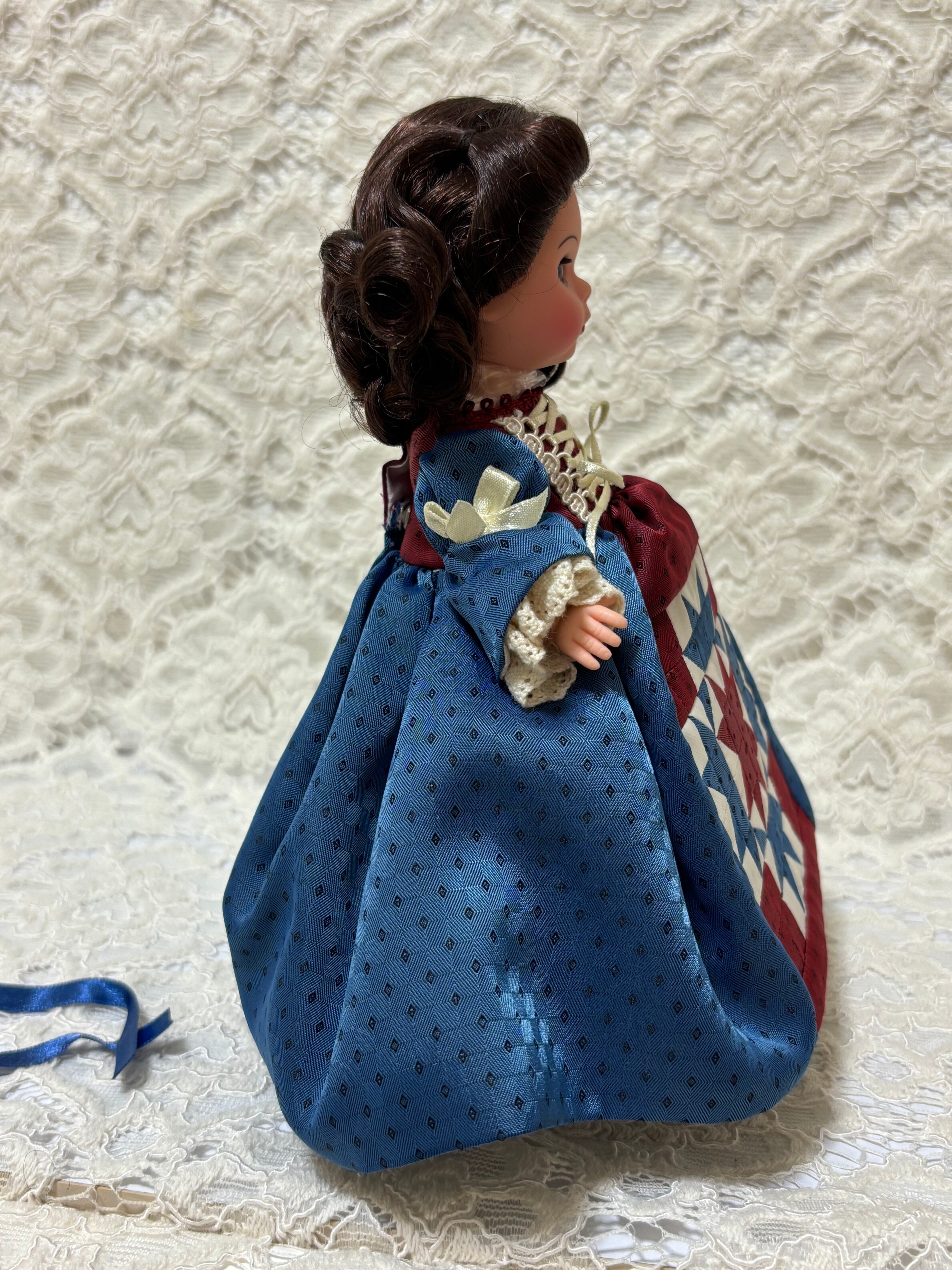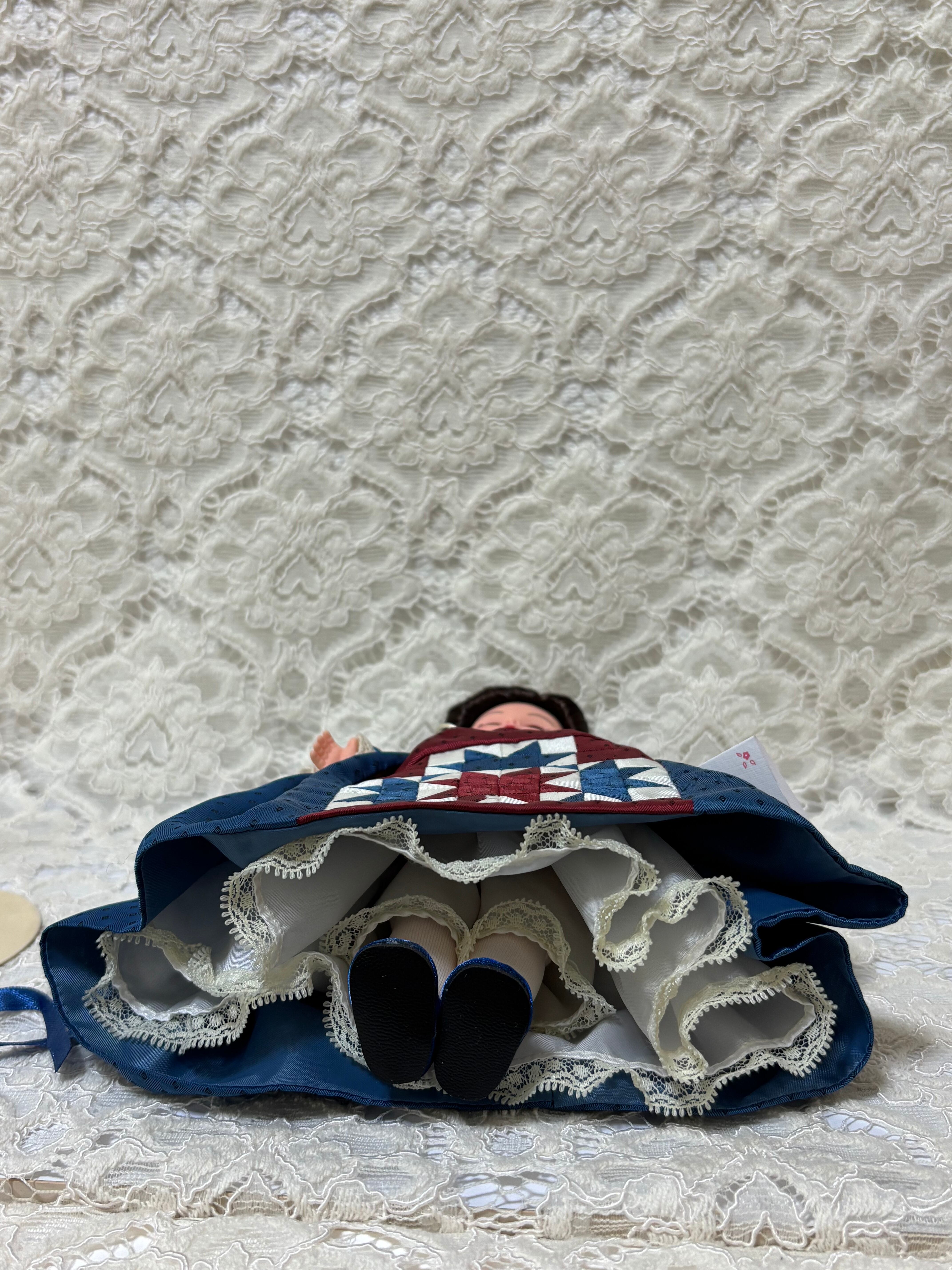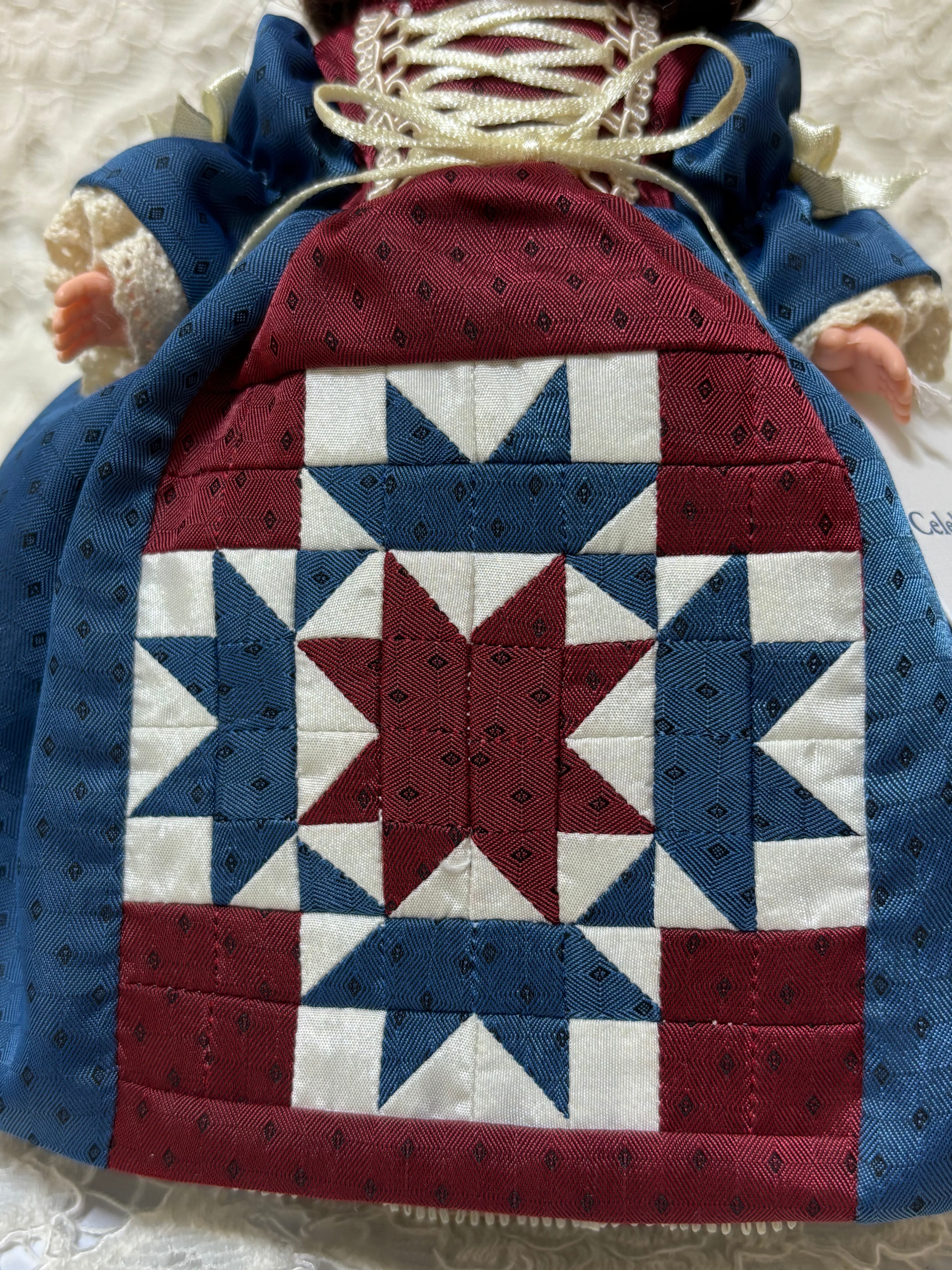 キルトといえば、欧州からアメリカに伝承されて、1800年からアメリカで洋服の布切れを合わせて縫う文化が始まりました。キルトのことは詳しくはないのですが、ドールのキルトは代表的なデザインなのかと思います。国旗に関係しているのかとも思います。