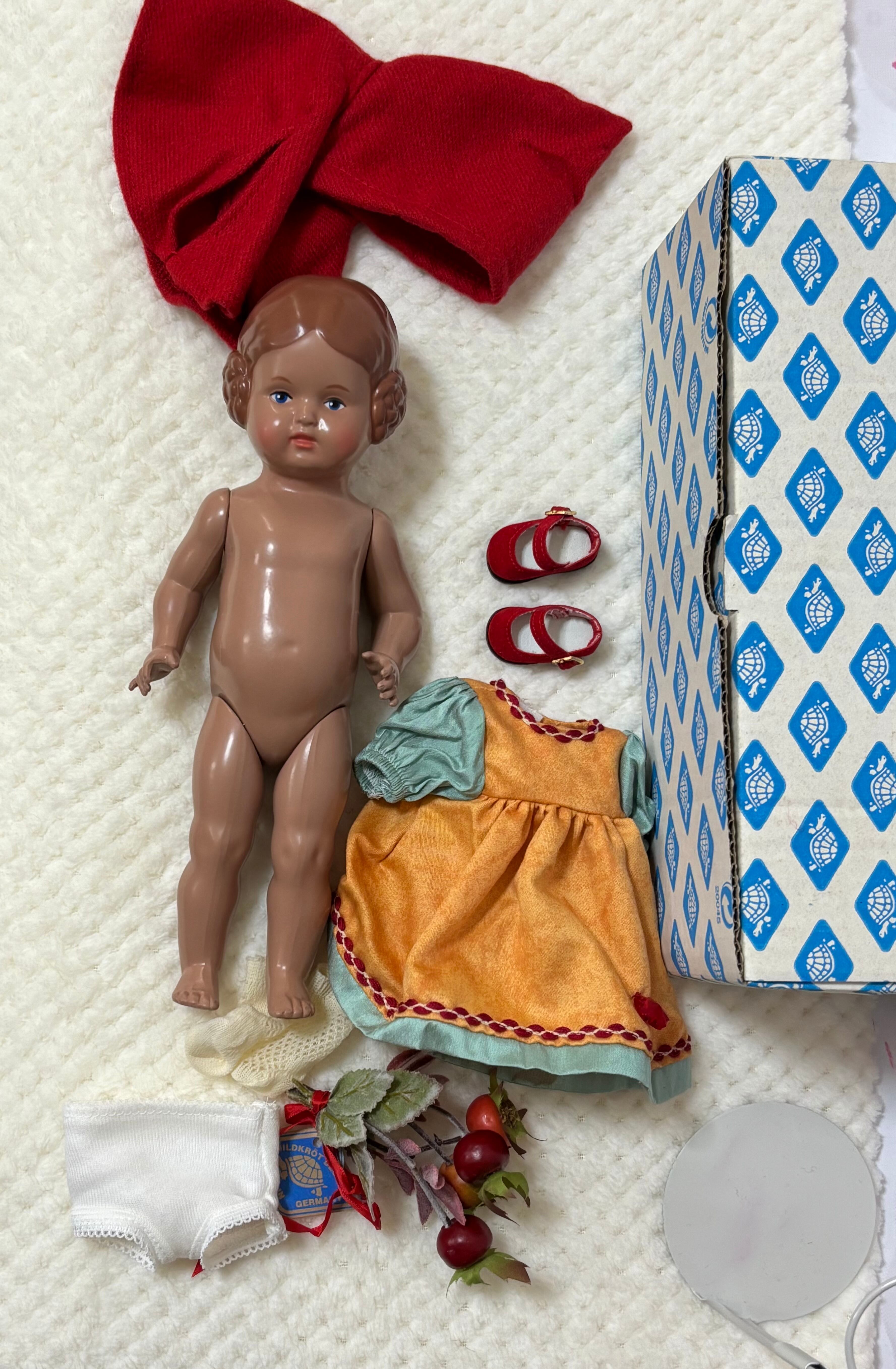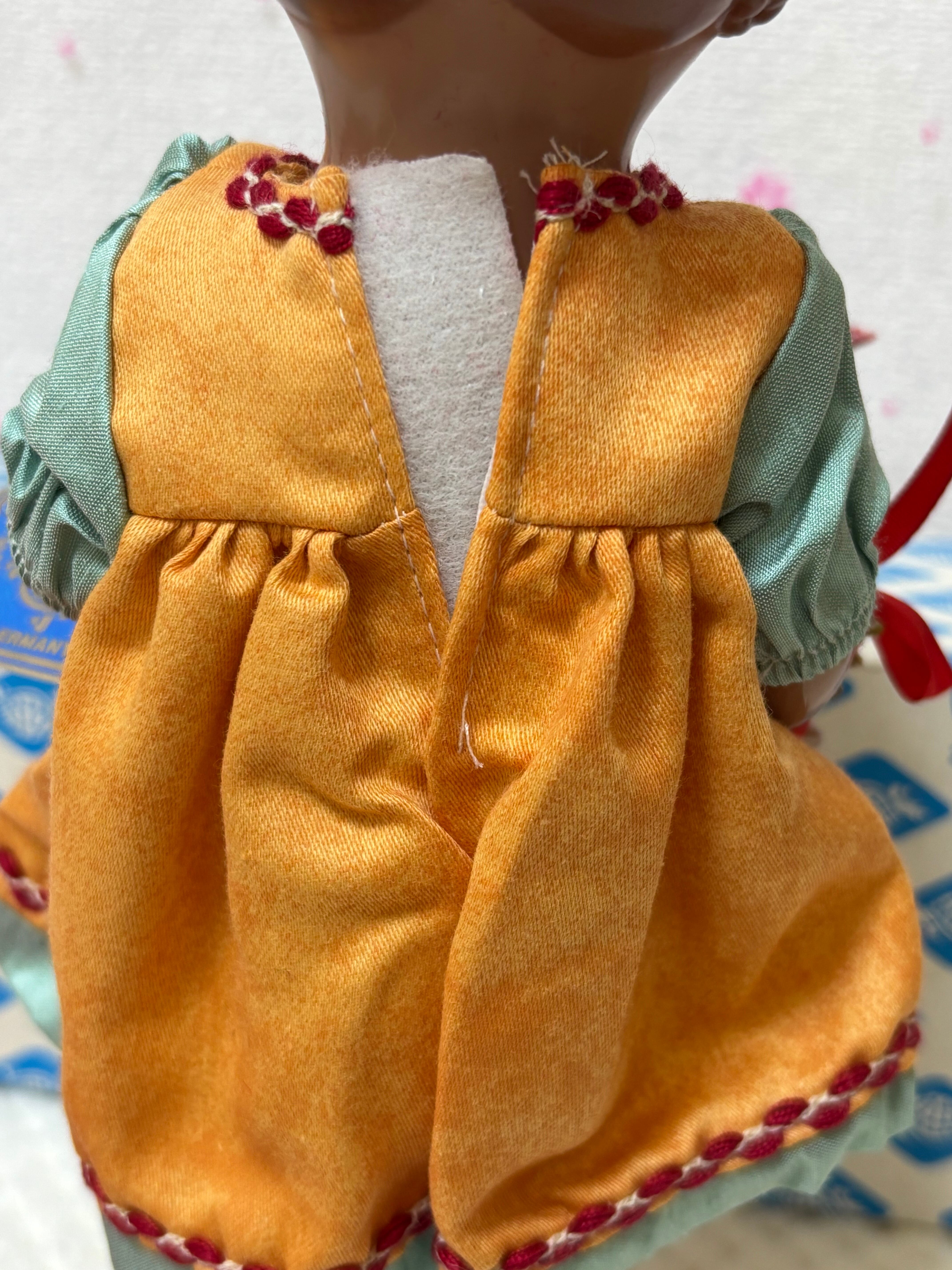 このドールは童話に出てくる赤ずきんちゃんかしら?とも思いますが不明です。材質はセルロイドとプラスチックの中間の素材です。