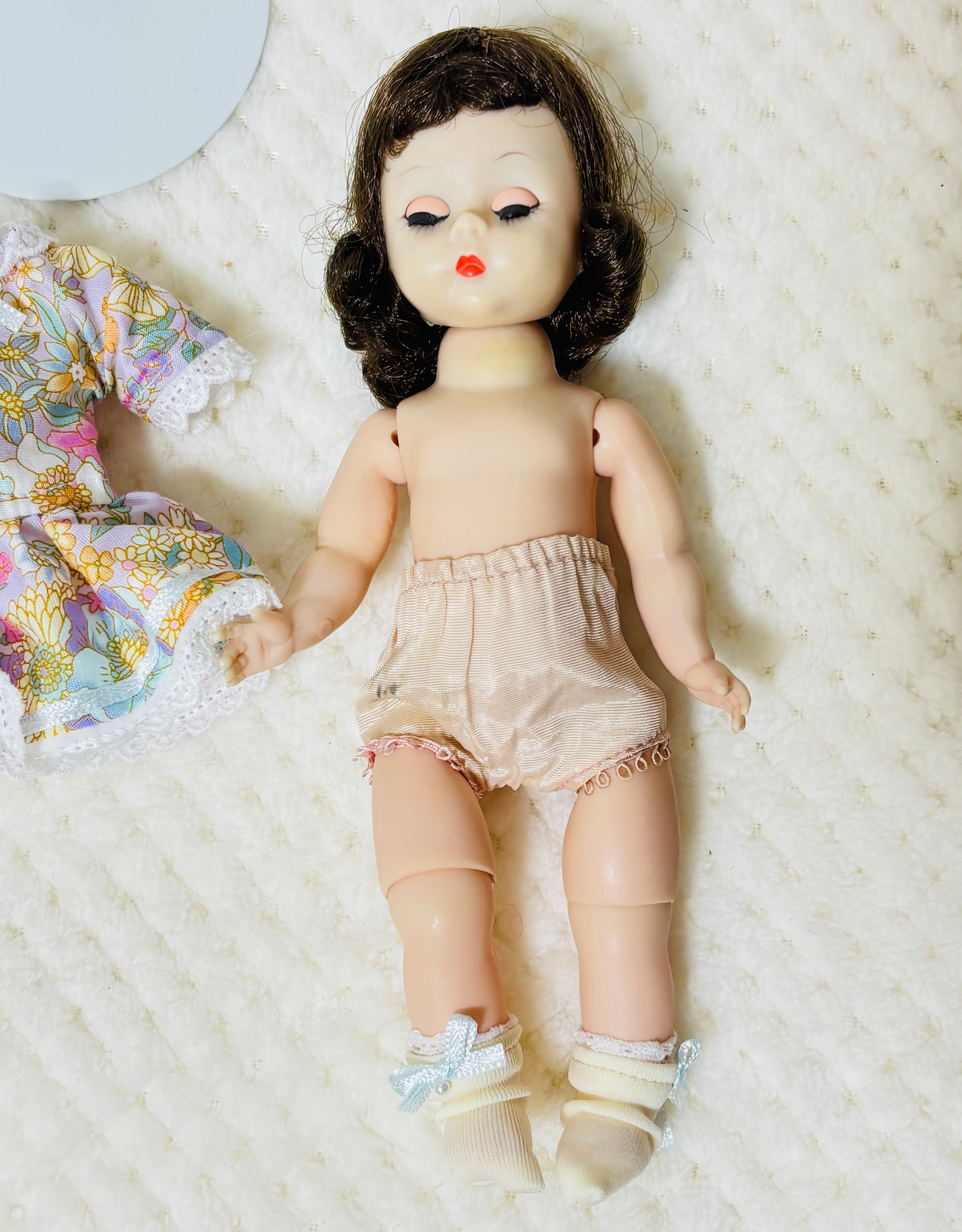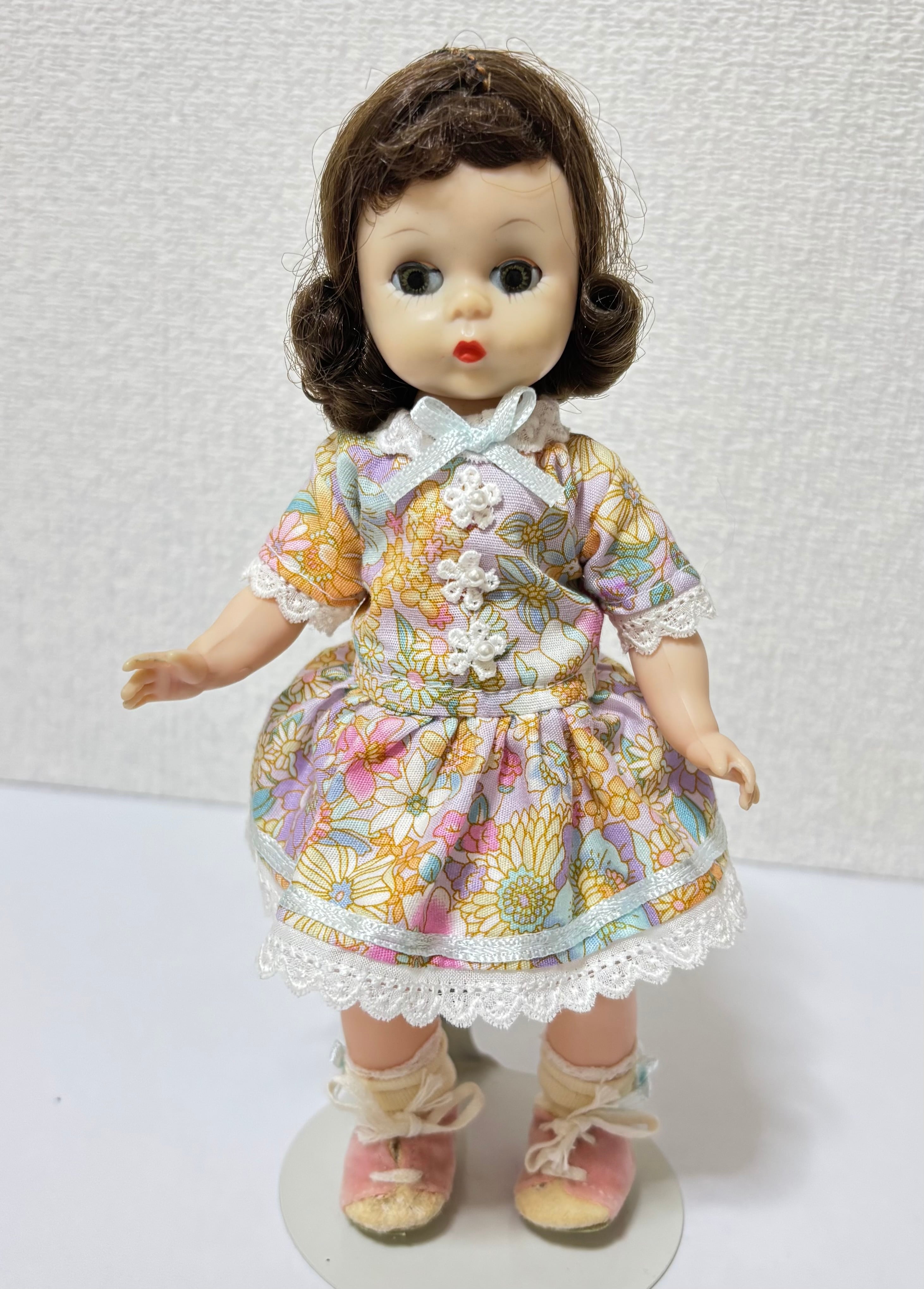 このマダムアレクサンダーはお膝が曲がり、歩くと首を左右に振ります。今では貴重なヴィンテージドールです。1956-1965年までアメリカでつくられていました。目はスムーズにオープンクローズします。漆黒の髪の毛もよくまとまっています。下着だけで当店にきました。ローウエストのワンピースとリボンが付いた靴下をつくっていただきました。