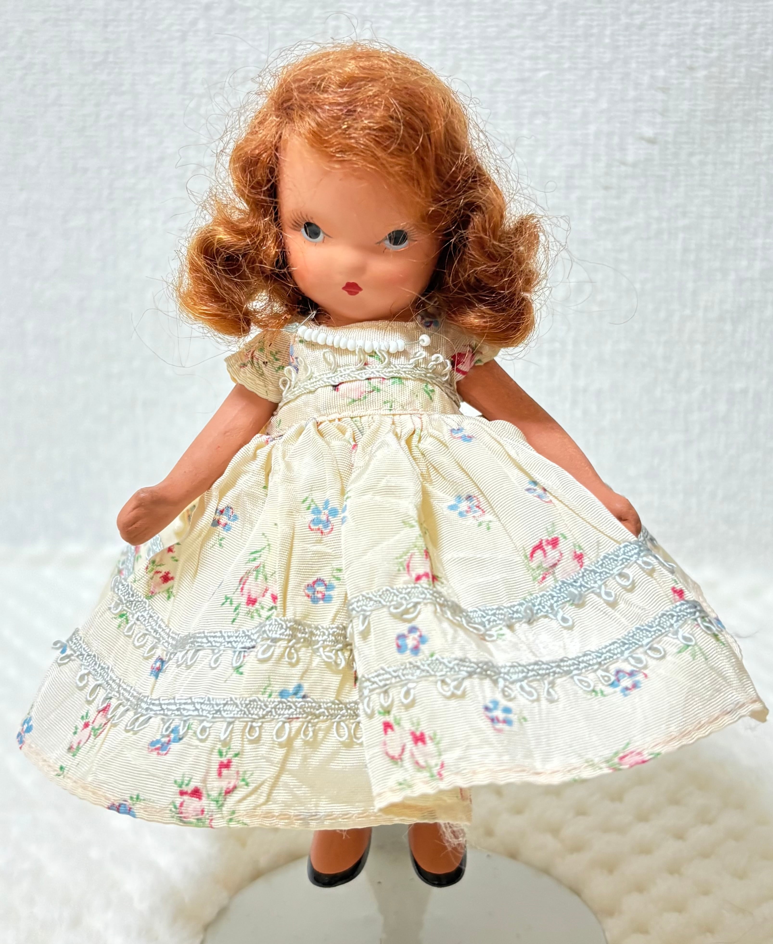 アメリカの一般家庭で1940年代に流行したビスクドール ナンシーアンストーリーブックドールです。初めは紙の着せ替え人形でしたが、やがてビスクドールになりました。このドールの洋服ですが、イギリスで有名な童話ゴルディロックス Goldi loksの主人公の女の子だということで譲りうけました。髪の毛は本来金髪なのですが、長い年月で別の子が洋服を着ているのかもしれません。髪の毛は毛糸出来ています。このドールはボディと足が一体型になっているタイプのドールです。