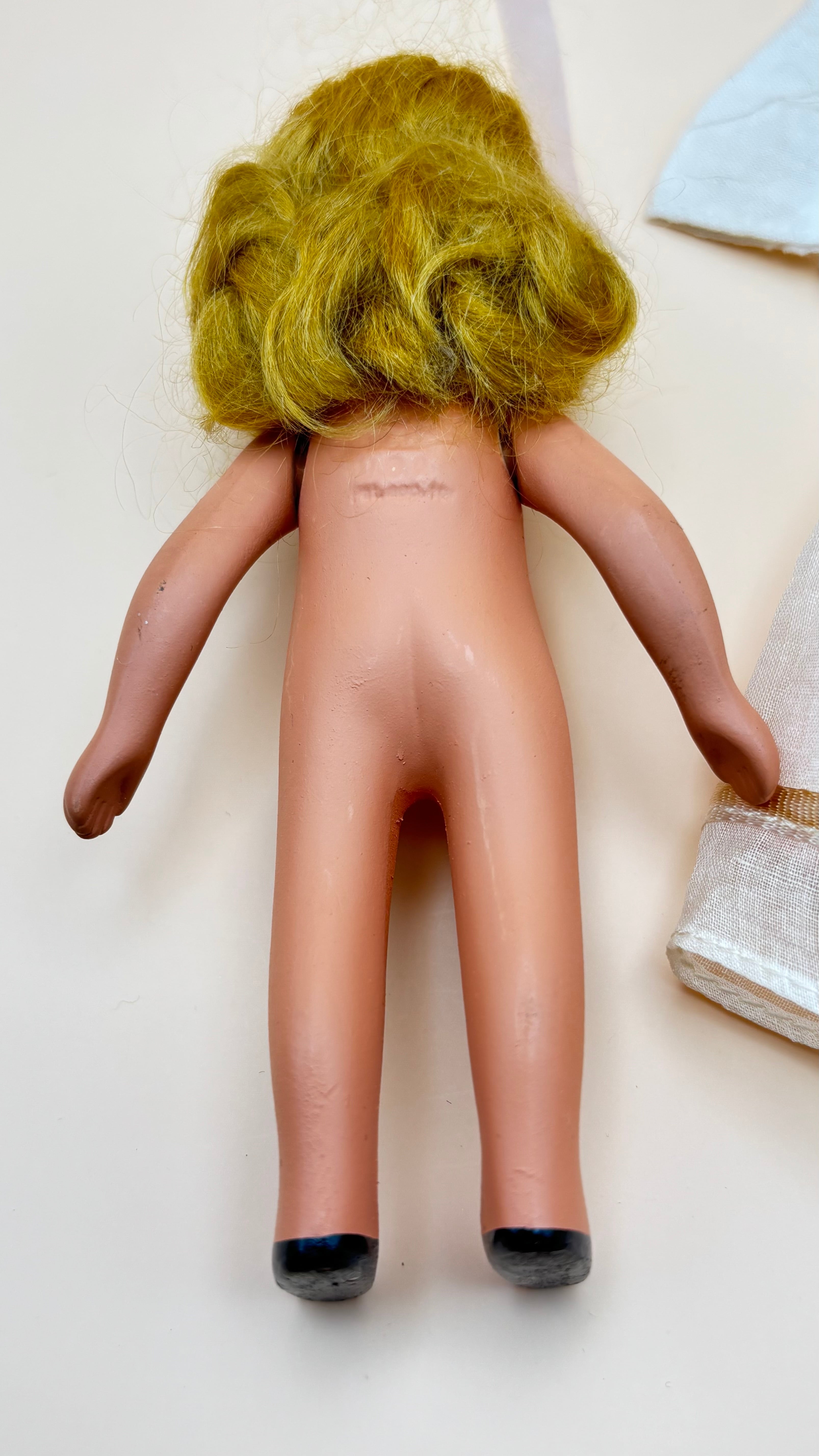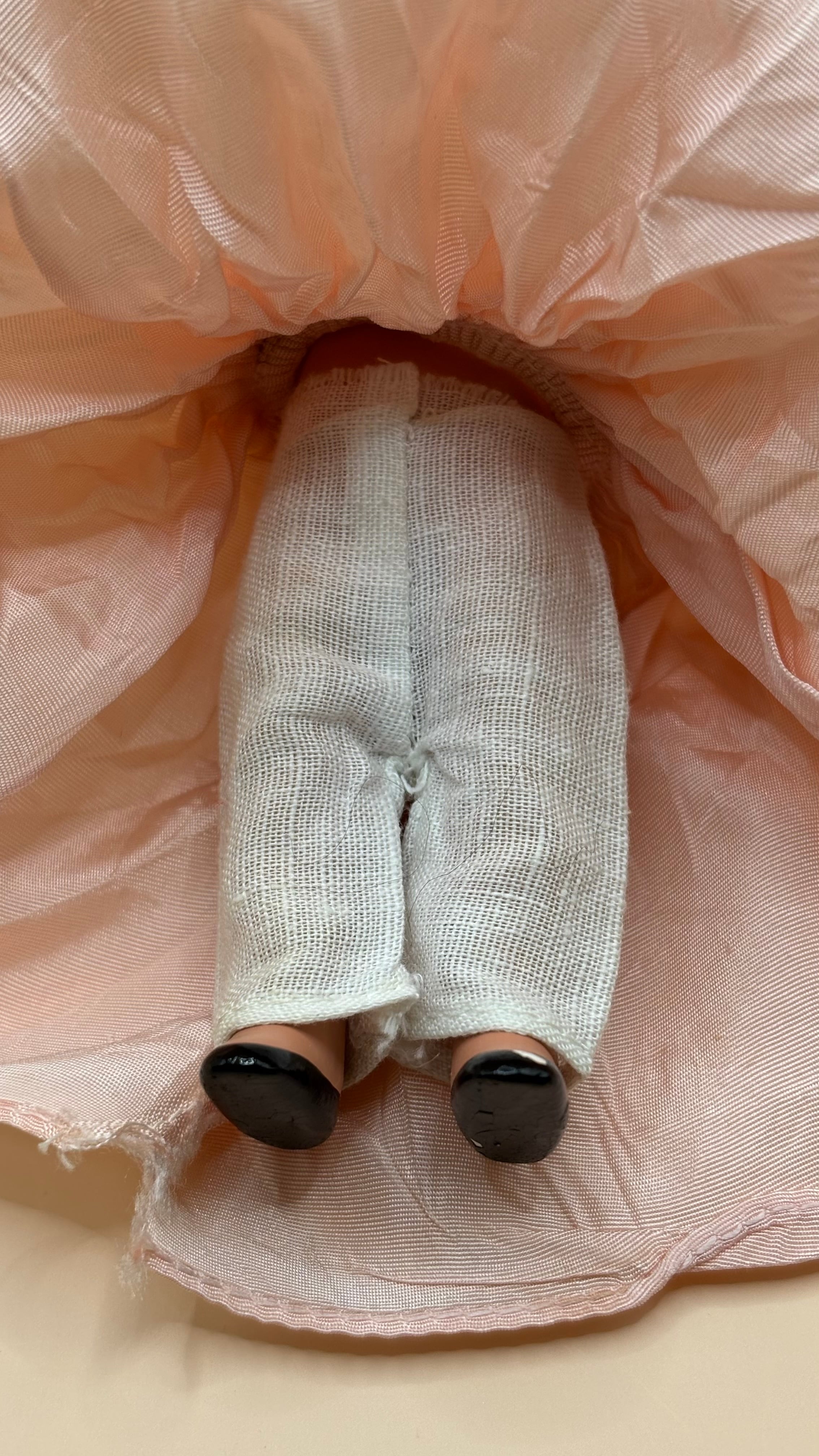 1940年代からアメリカで、人気を博したこのドールです。ビスクドールは脚がボディと一体型と、ボディと別に脚が接続されているタイプがあります。このタイプは一体型です。