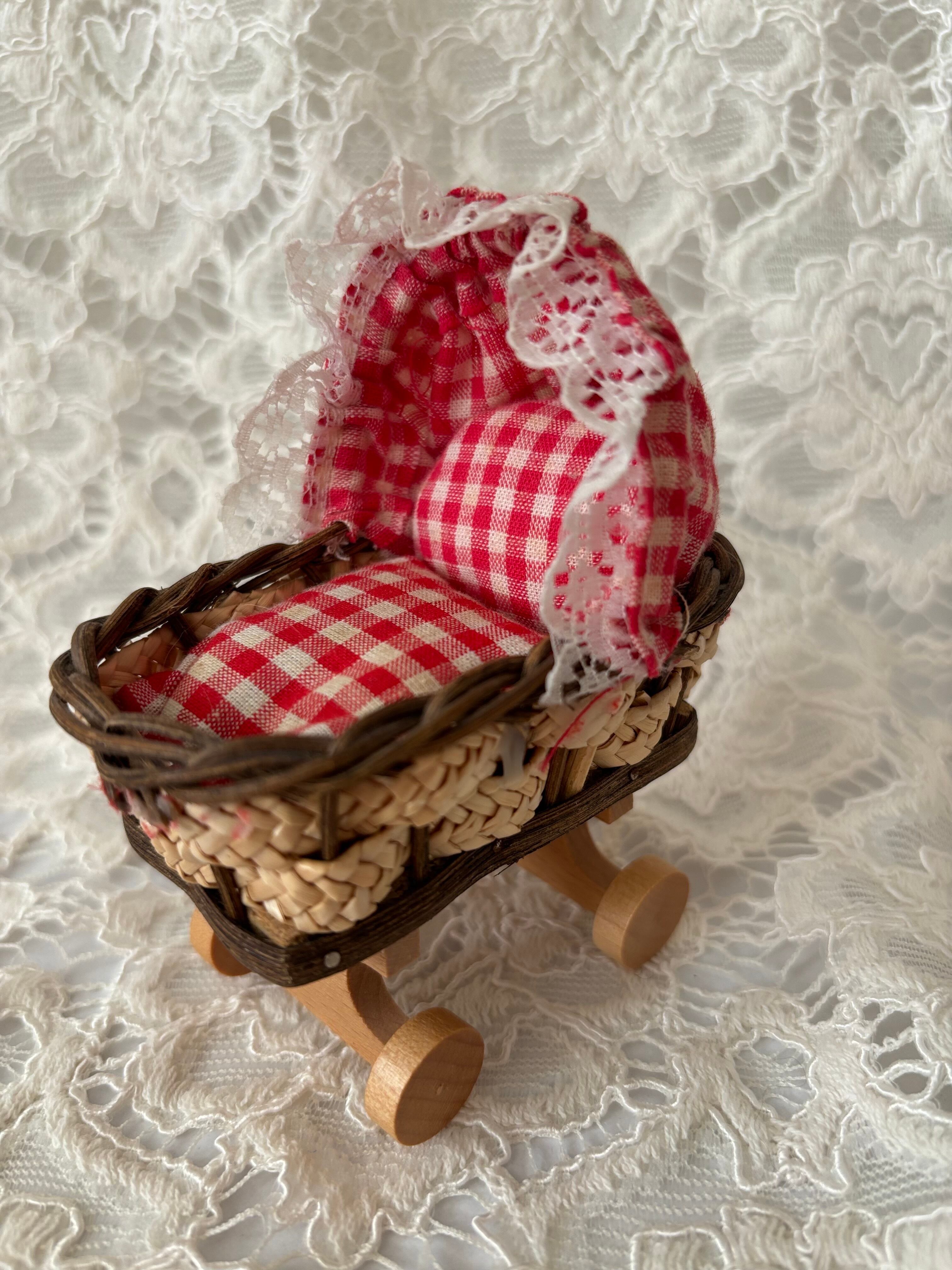 この木製の乳母車は、クマさんたちとドイツから一緒にきました。素朴でギンガムチェックが可愛いです。
