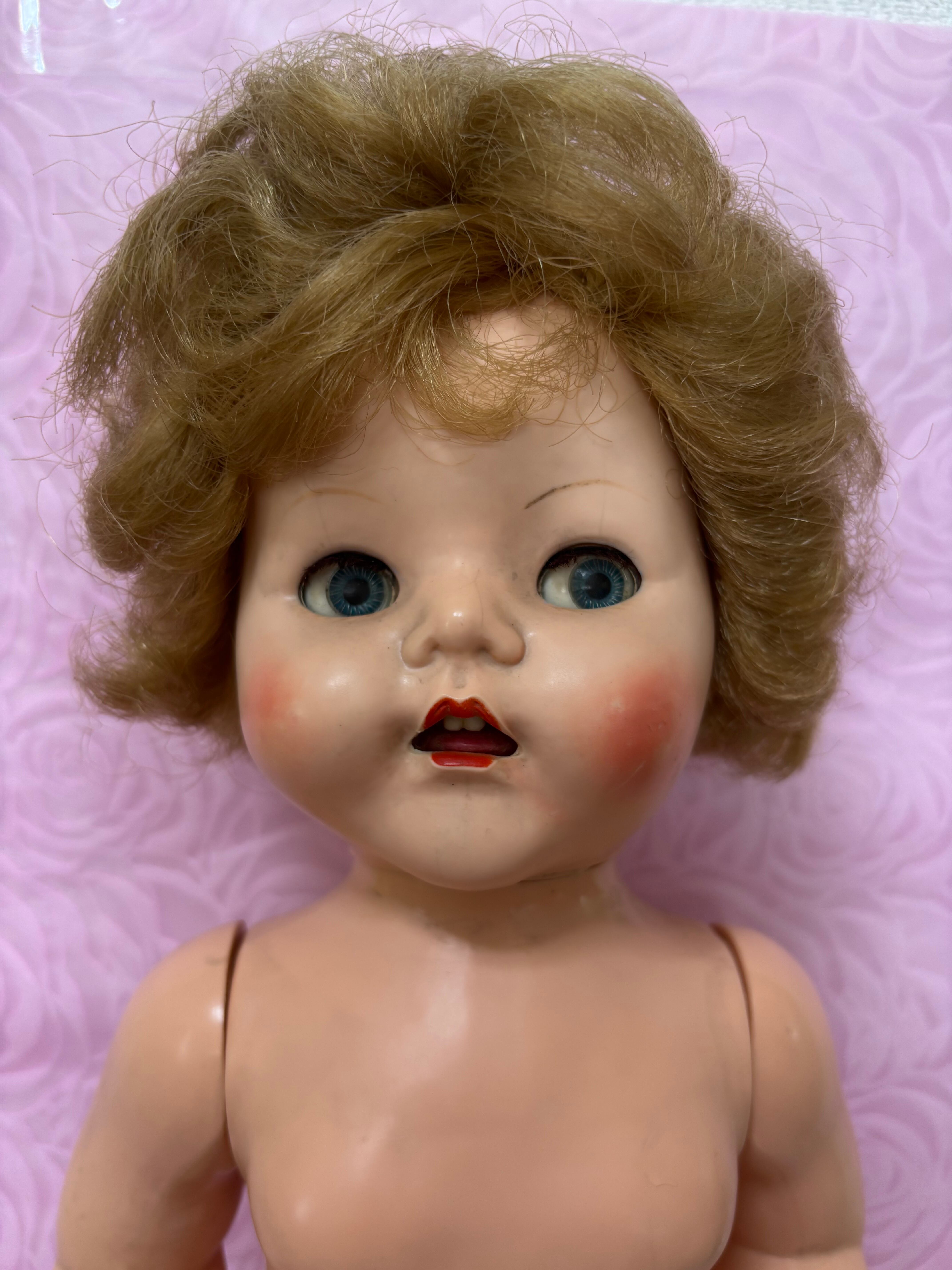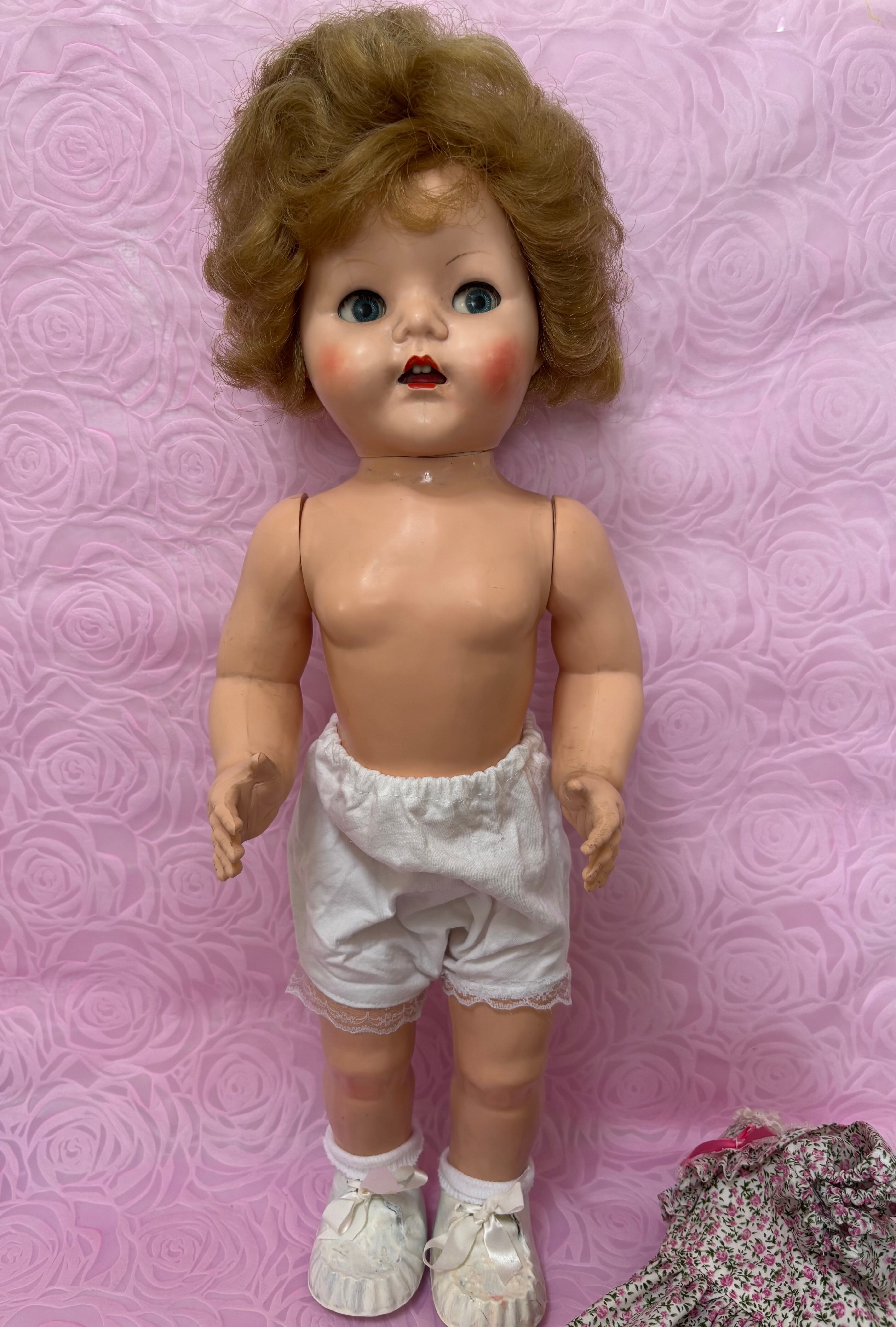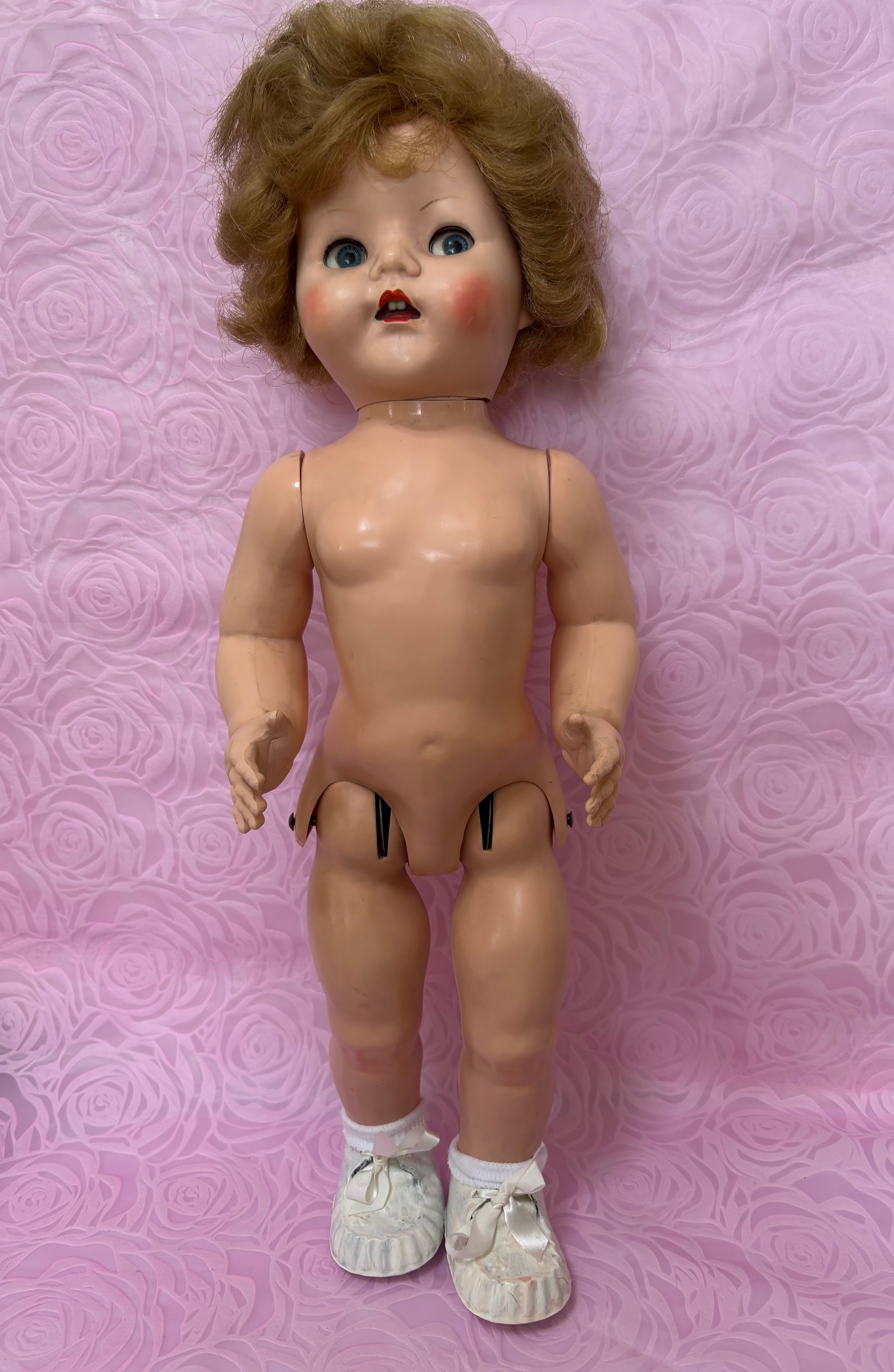 はるばるイギリスからきました。1950年代のドールです。歩くと首を振ります。硬質プラスチックで出来ています。全長54cmで存在感があります。テディベアなどと飾っても可愛いと思います。ワンピースと靴はオリジナルかどうかは不明です。靴は白くペイントした跡があります。