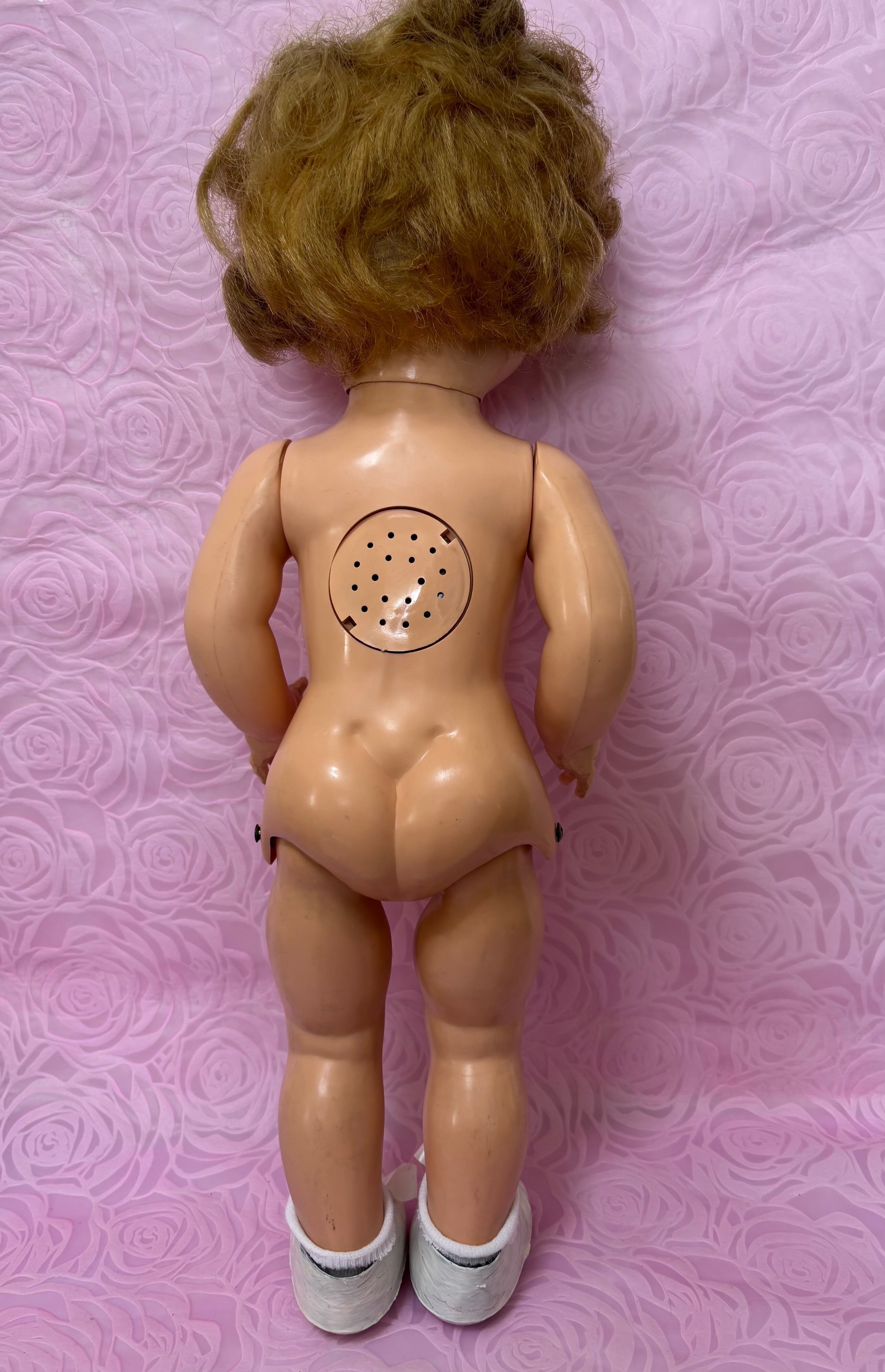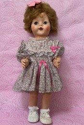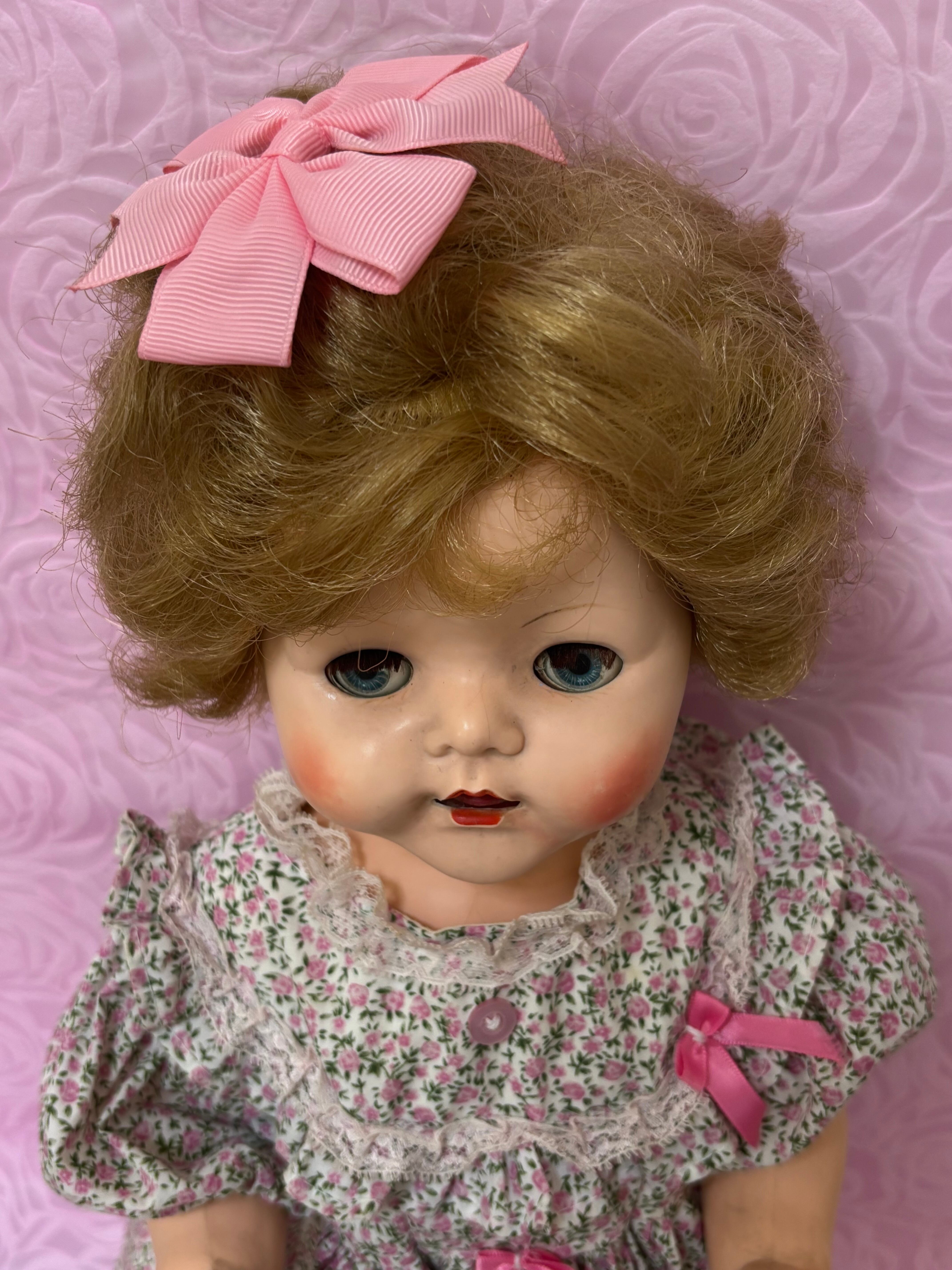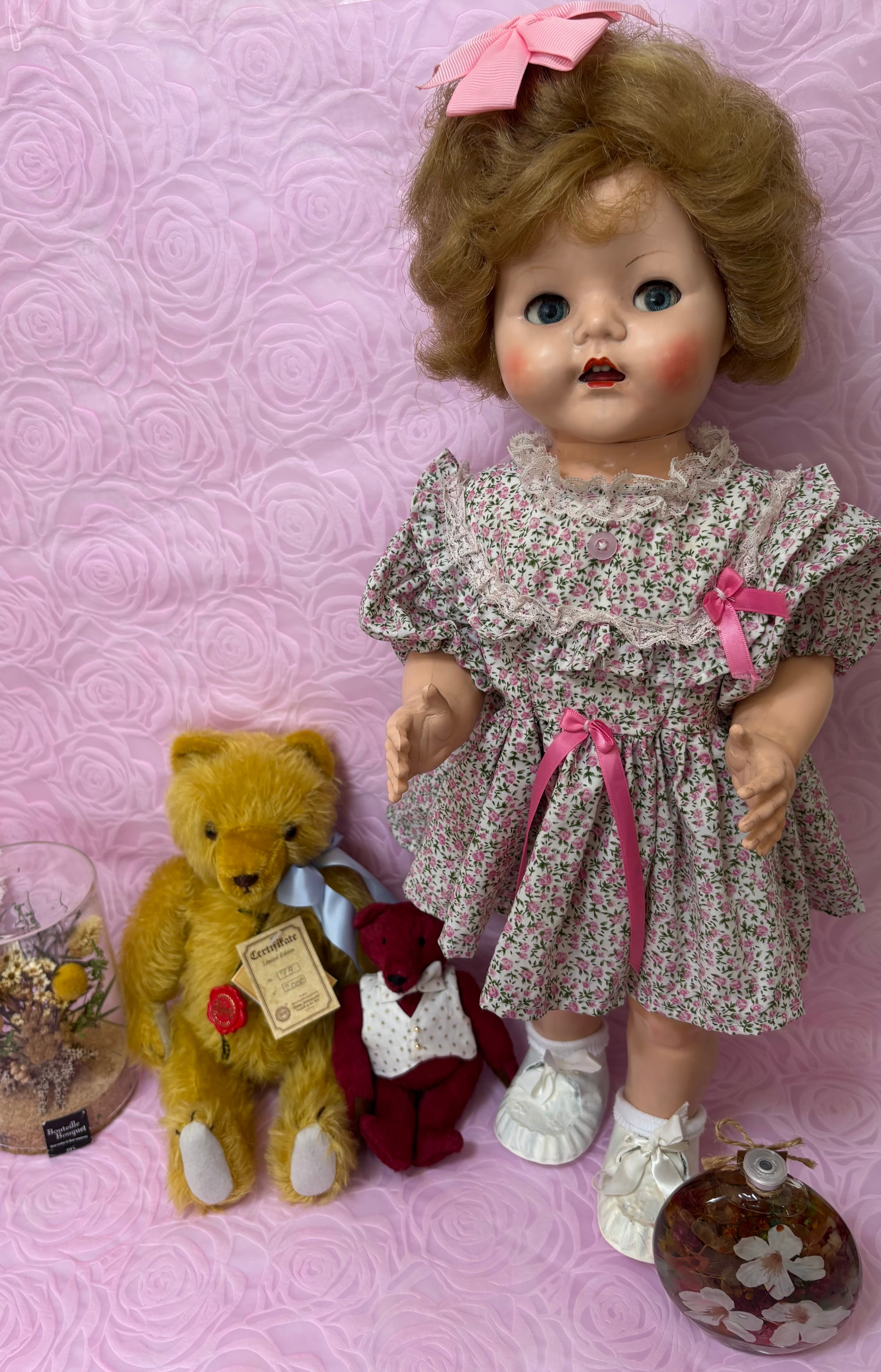 はるばるイギリスからきました。1950年代のドールです。歩くと首を振ります。硬質プラスチックで出来ています。全長54cmで存在感があります。テディベアなどと飾っても可愛いと思います。ワンピースと靴はオリジナルかどうかは不明です。靴は白くペイントした跡があります。