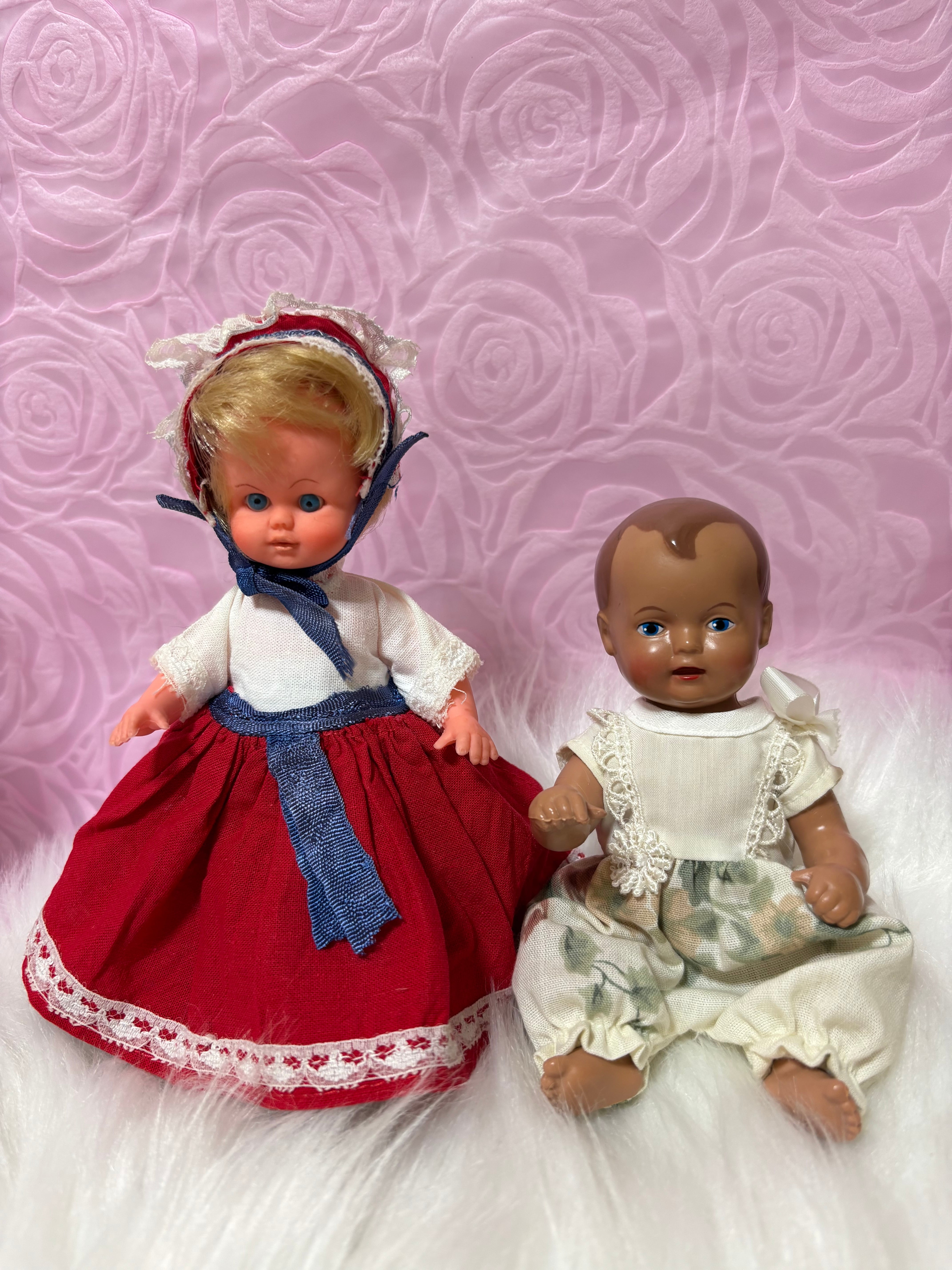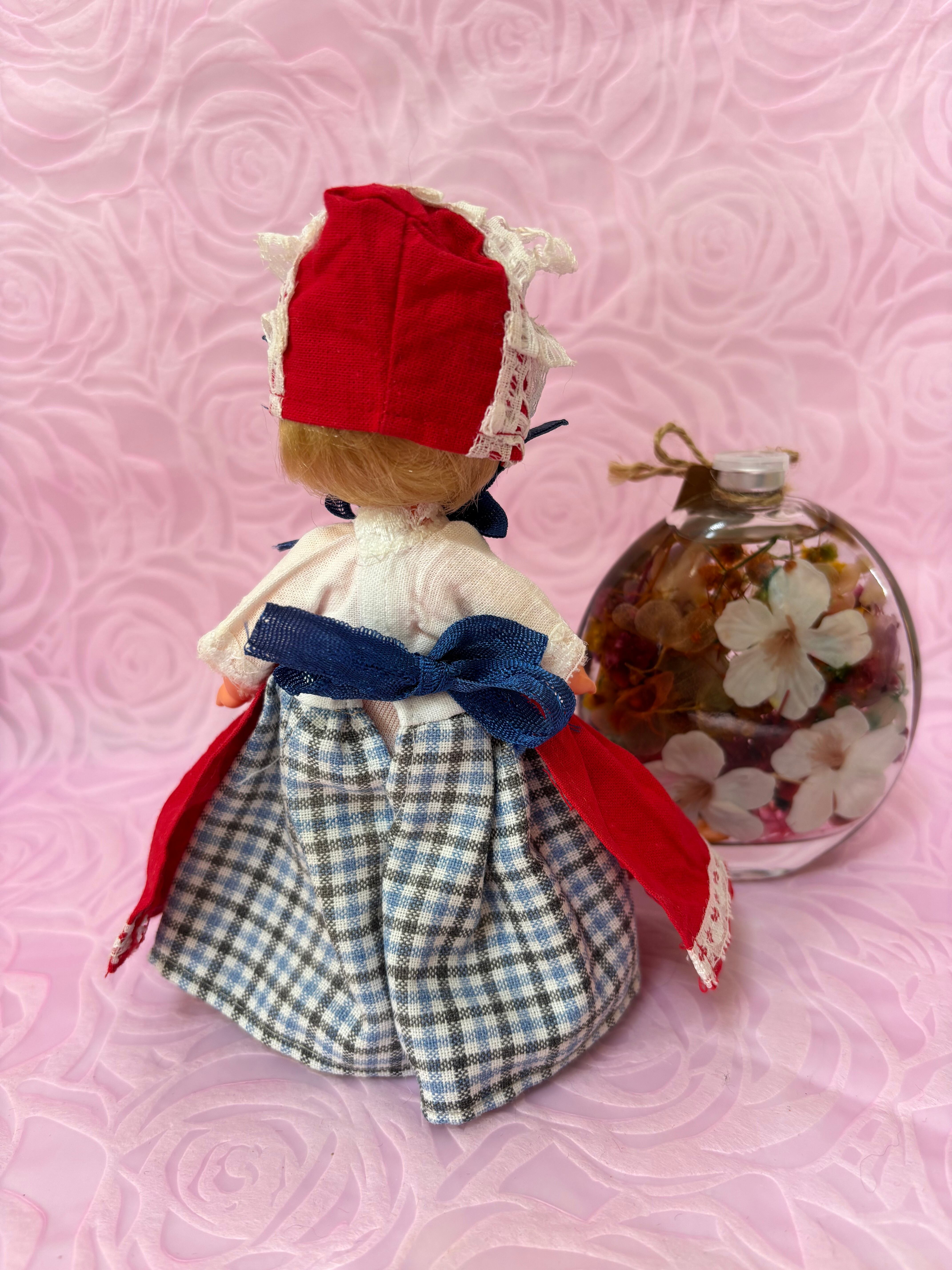 洋服は赤い頭巾にに赤いエプロンをしています。