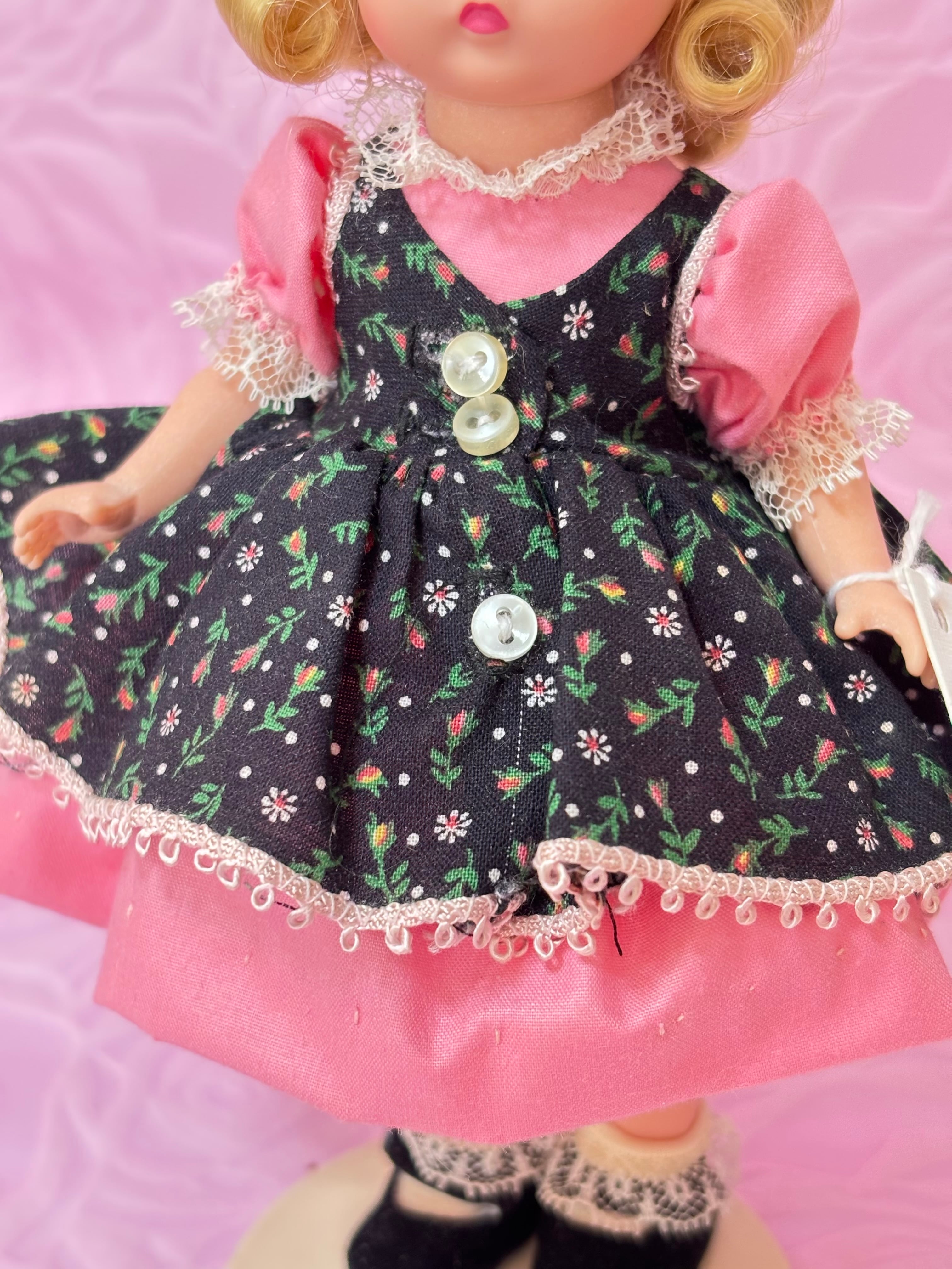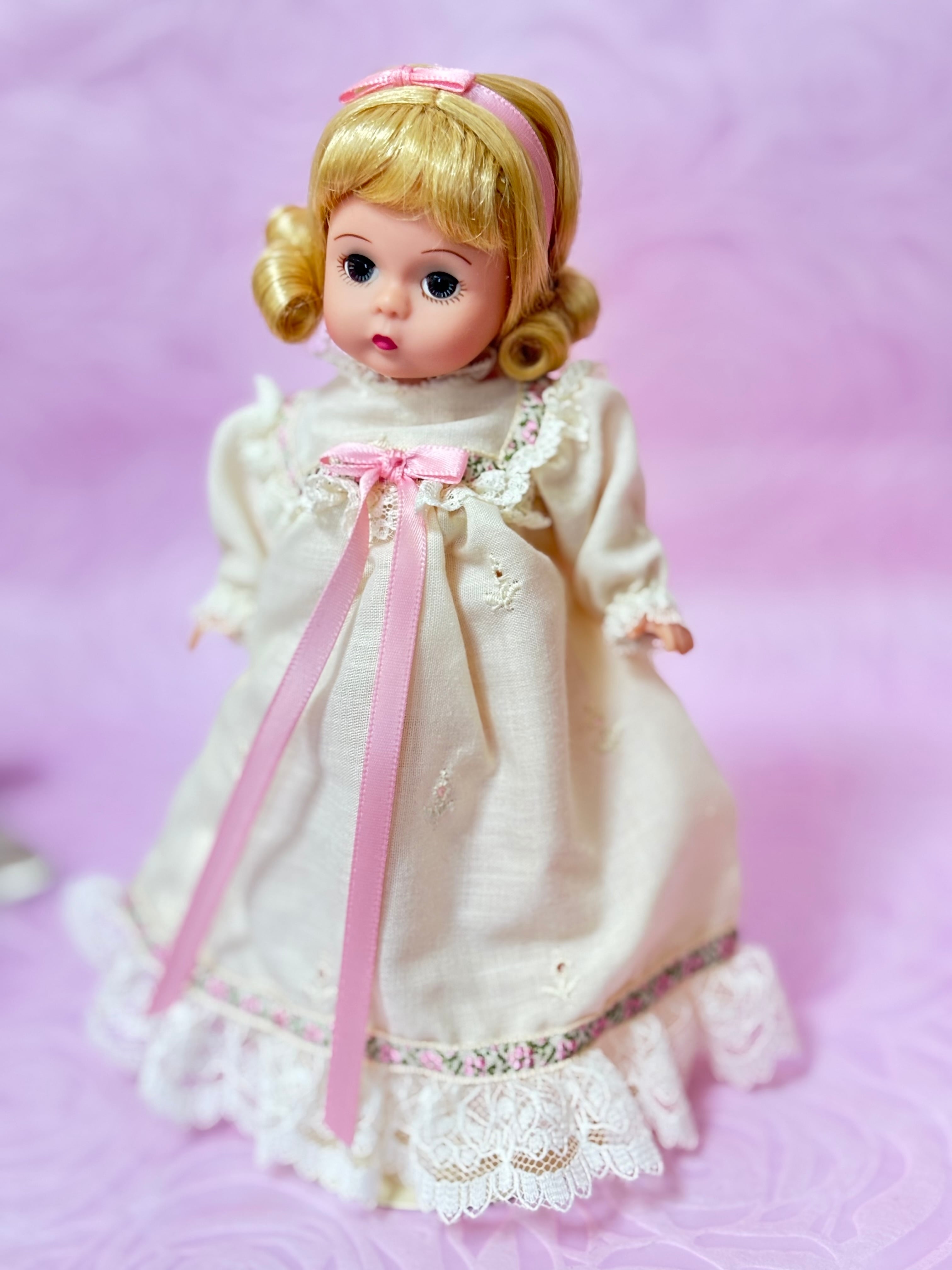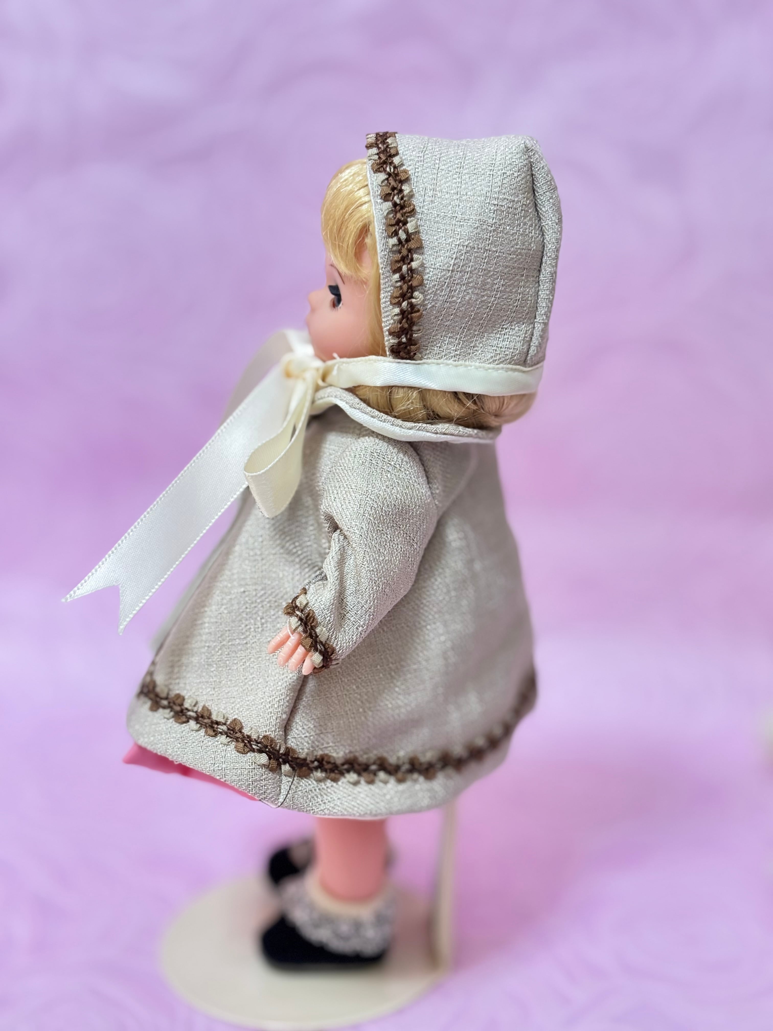 アメリカの人形連盟が主催している国際大会に2000年に出品されたドールSusanです。人形はプレイセットとしてつくられたもので、可愛いピンクのワンピース、コートとフード、ネグリジェを着せ替えして楽しむようになっています。しまっておけるようにビニールのケースが付いています(一部破損)