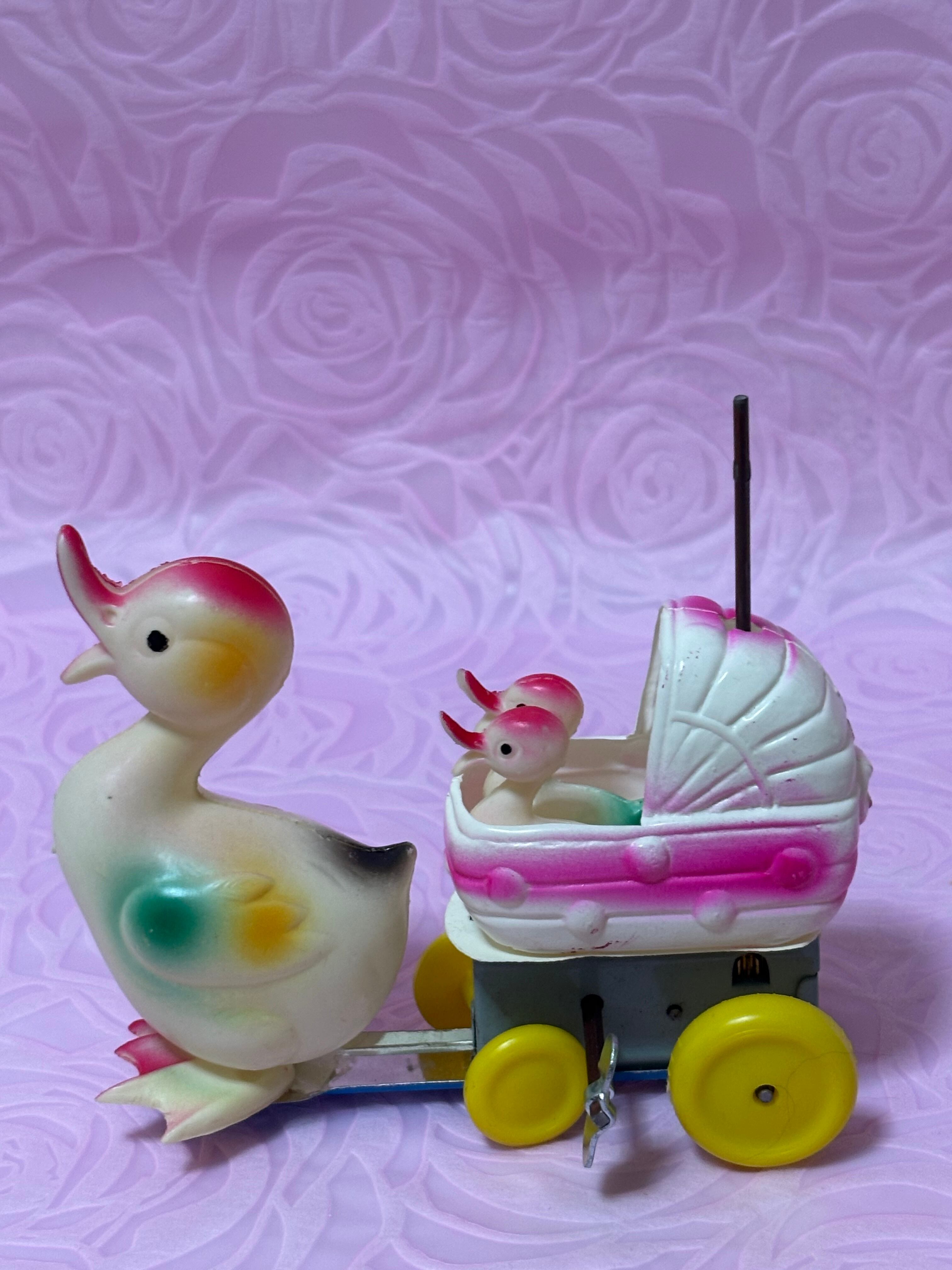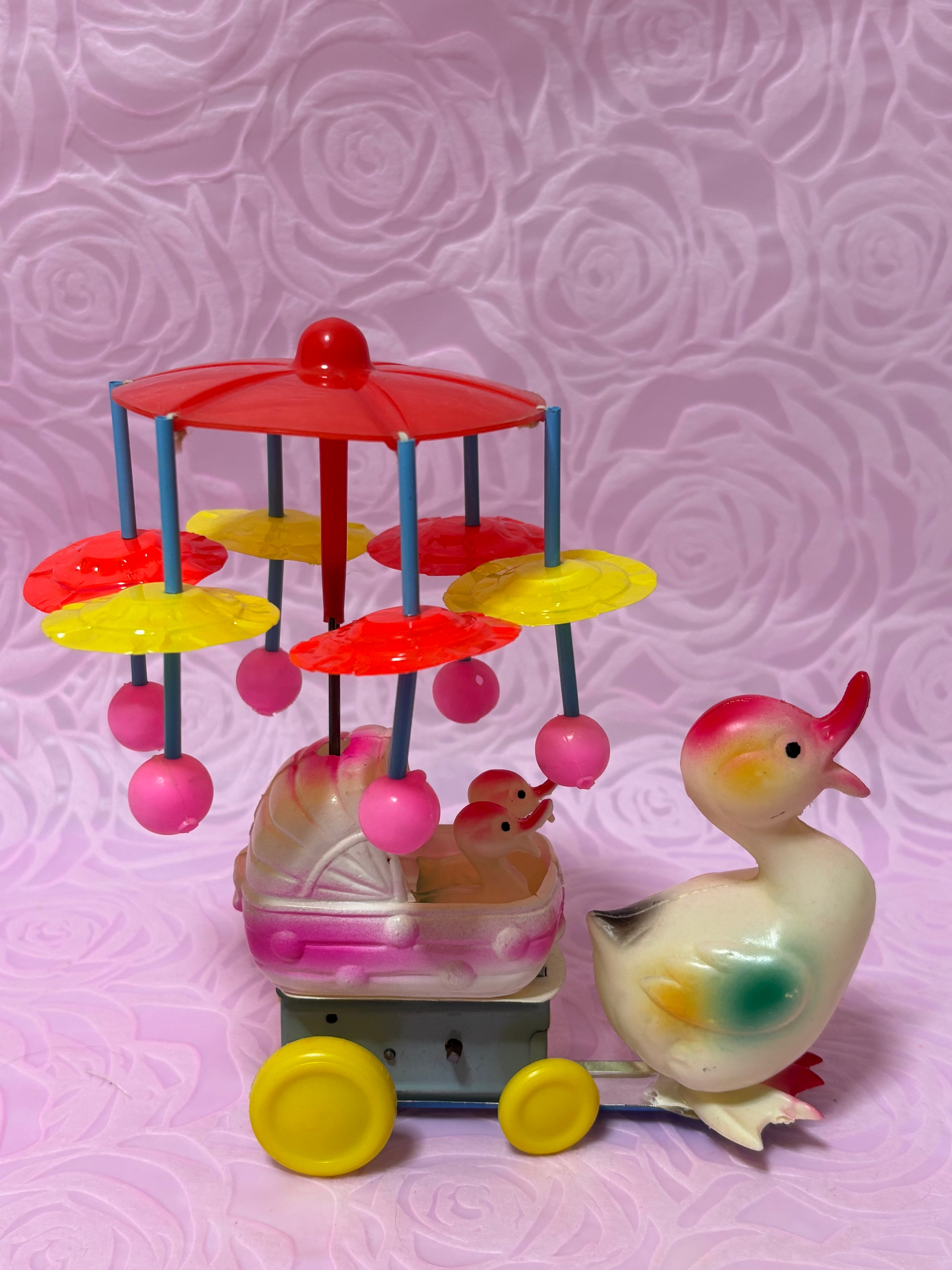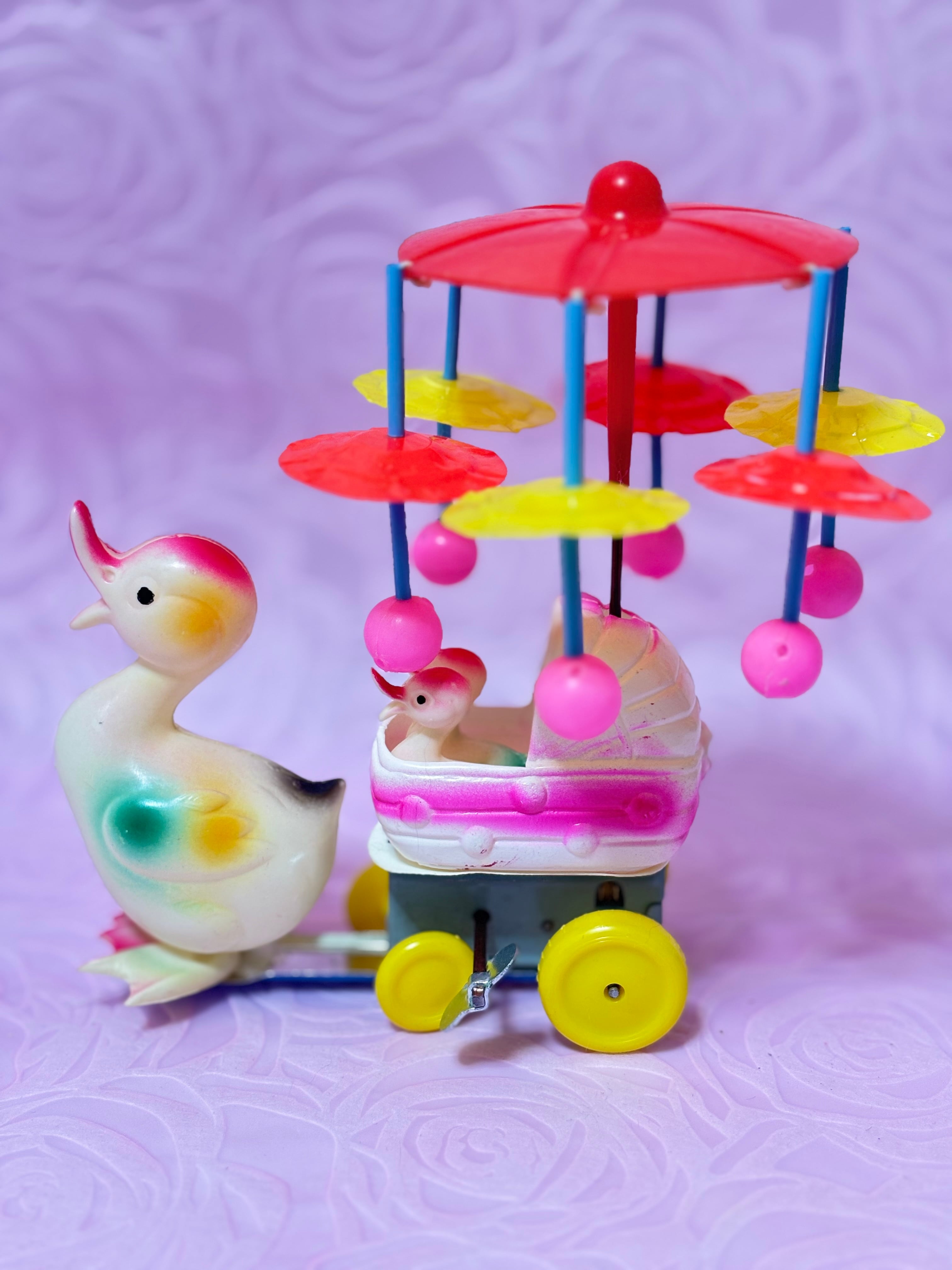昭和の時代に作られたものです。箱には何の印刷もないのでどこの会社の製品かわかりません。回る鮮やかな丸い飾りはセルロイドで、鳥さんの親子はビニールのような材質です。色の吹き付けも綺麗に残っています。ネジを巻くと元気よく傘の部分が回りますが、鳥さんを乗せた車輪は動きが悪いです。